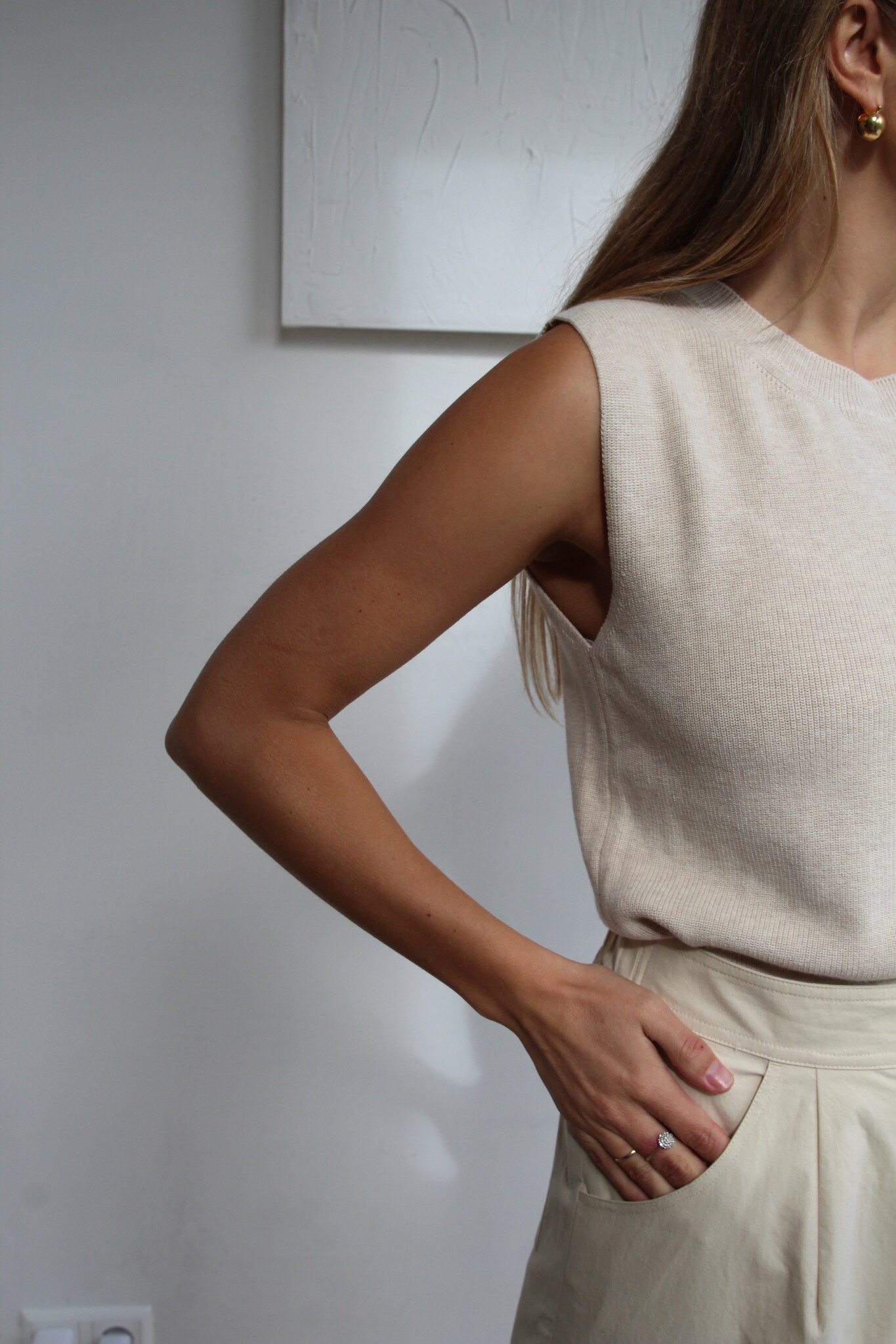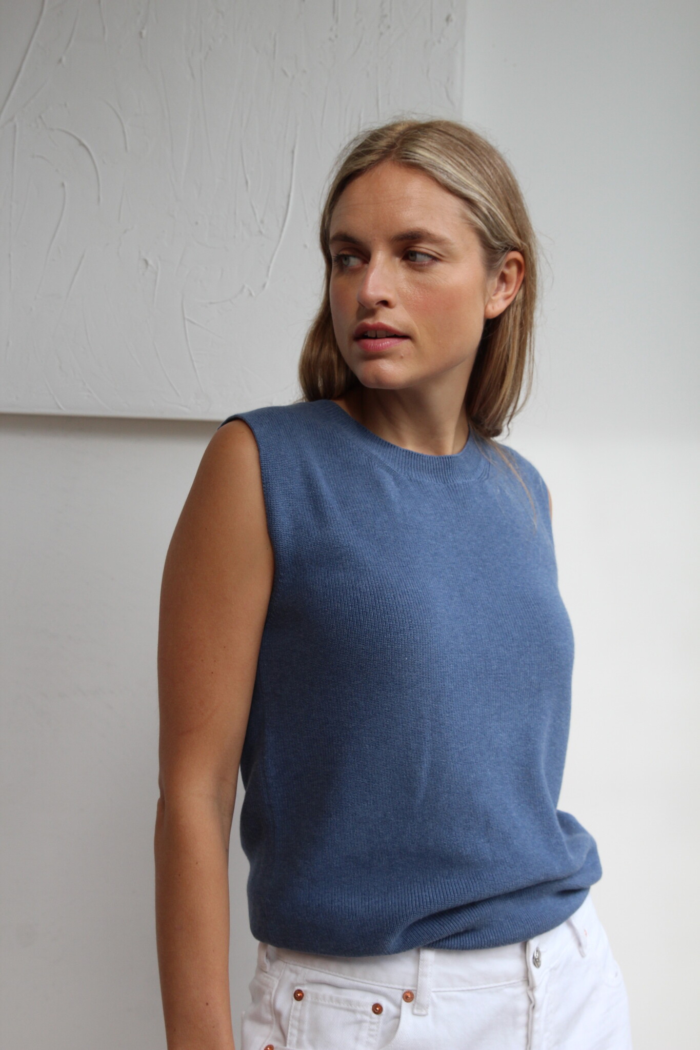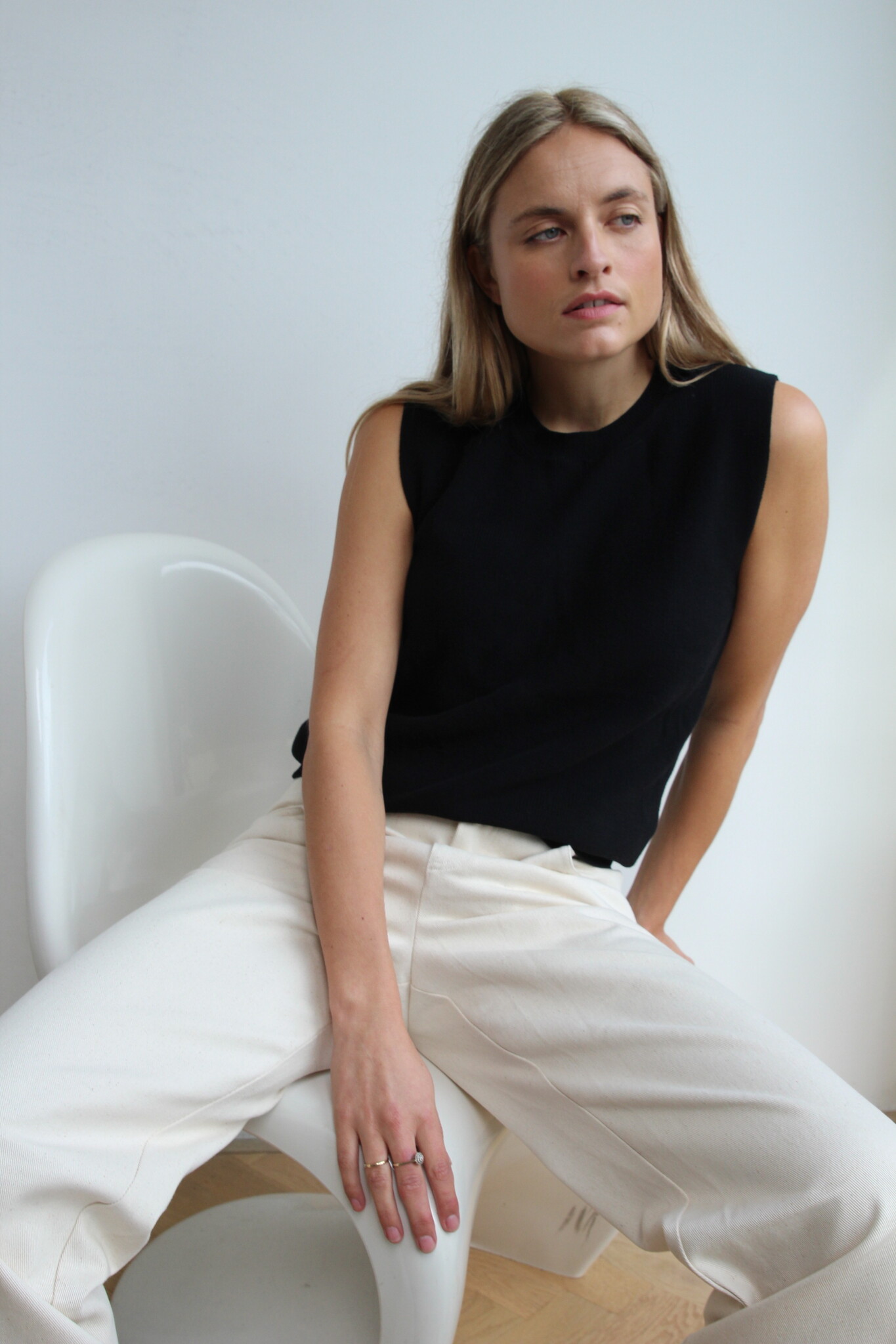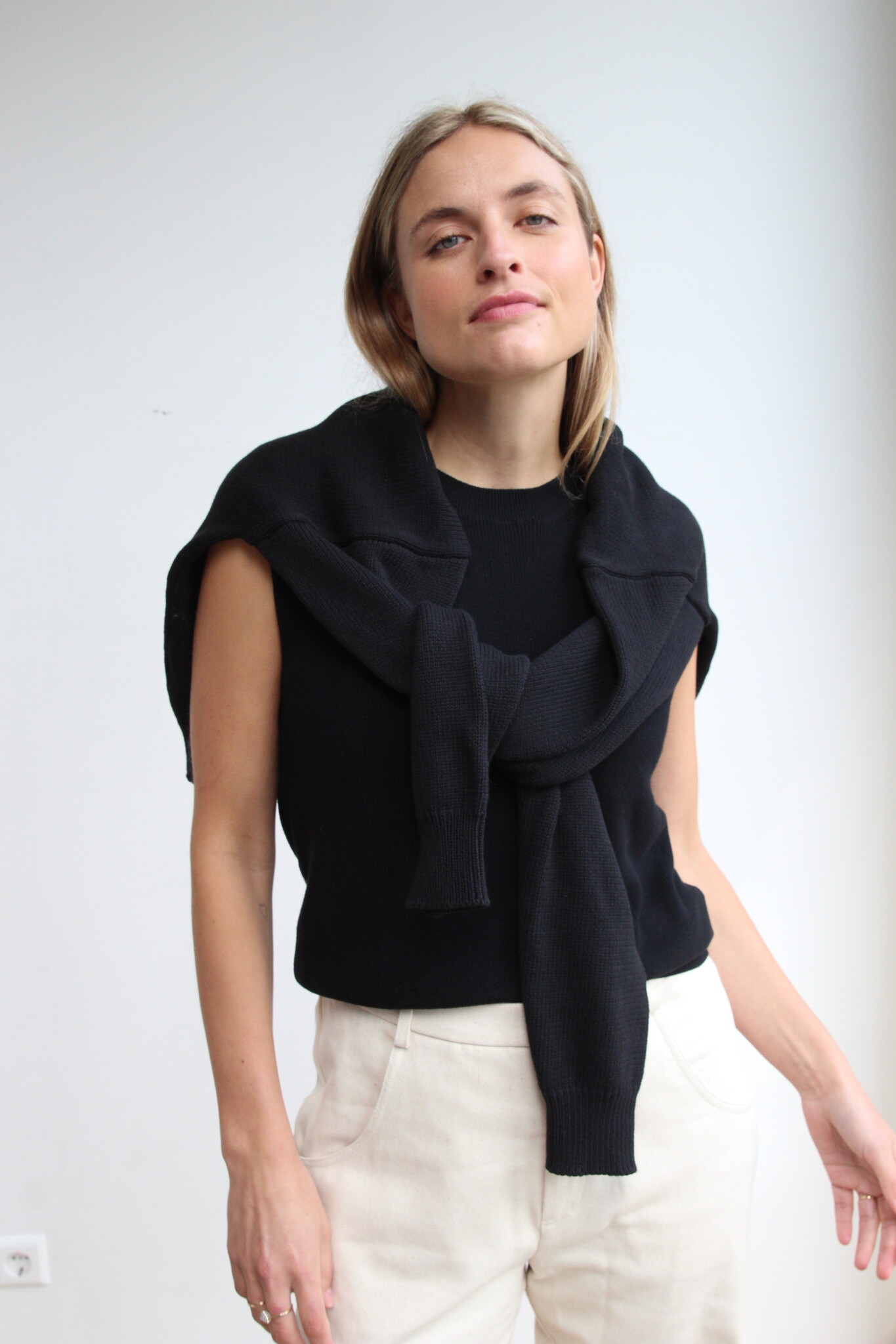 Het Barthou vest is vekrijgbaar in drie verschillende kleuren. En kan gedragen worden als twin-set samen met de Badiou top.