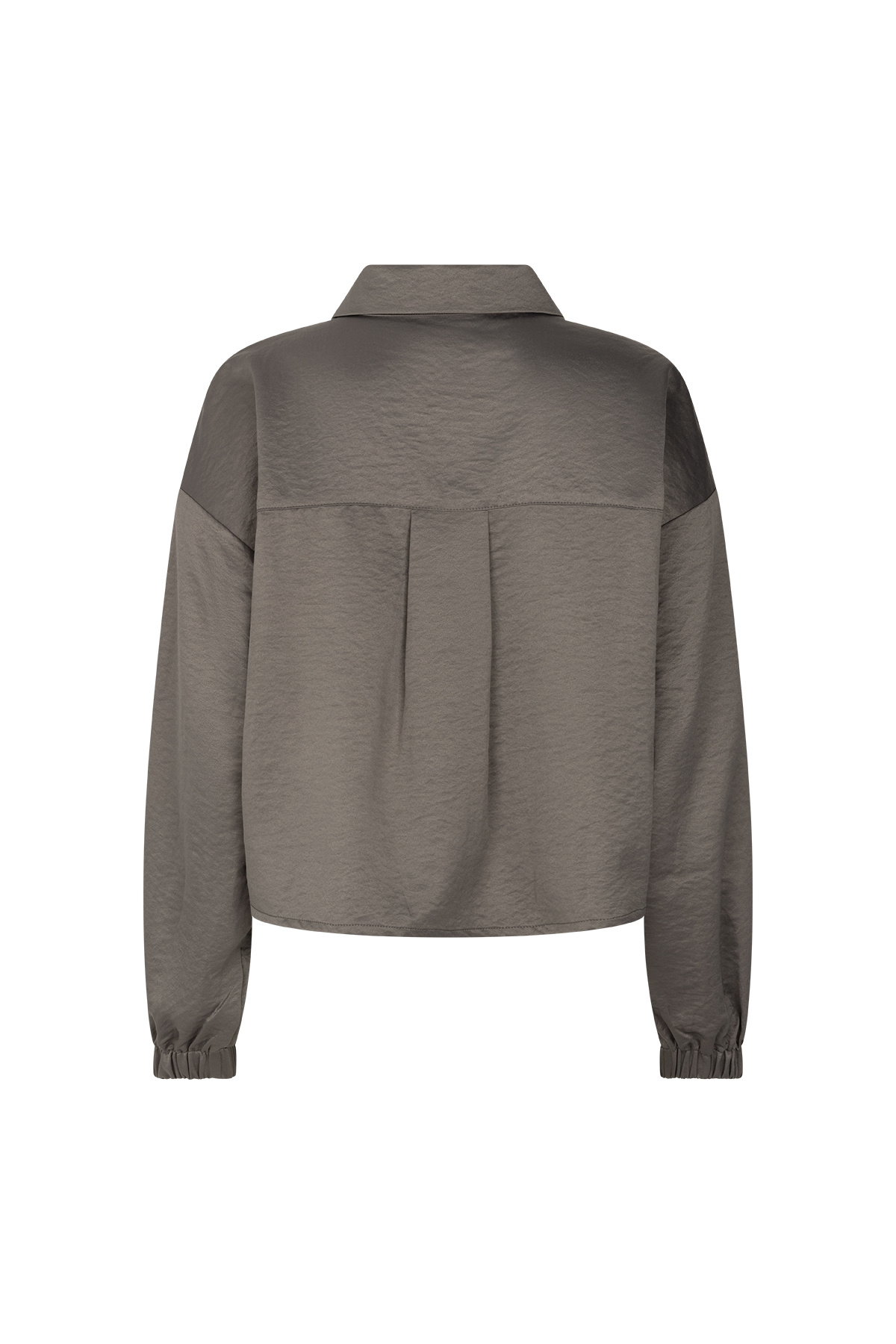 Modern blouse in a refined taupe shade with a minimalist aesthetic. Designed with a classic shirt collar and long sleeves finished with elasticated cuffs for subtle volume. The fluid fabric and relaxed fit create a comfortable yet contemporary silhouette.