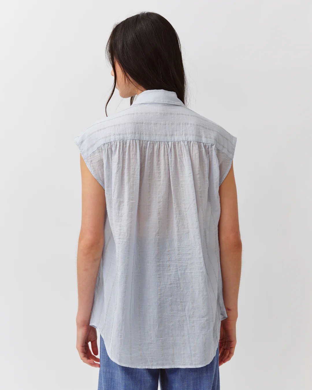 Sleeveless shirt with a loose and fluid fit. Designed with an open collar and partial button placket at the front. Slightly dropped shoulders and airy volume create a relaxed yet feminine silhouette. Finished with a rounded hem and refined detailing.