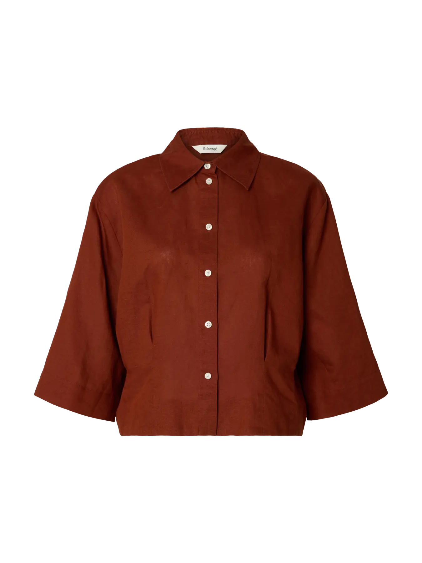Cropped shirt in a warm rust color with a classic collar and 3/4 wide sleeves. Features contrasting buttons and subtle pleat details. Regular fit for a modern, elegant look.