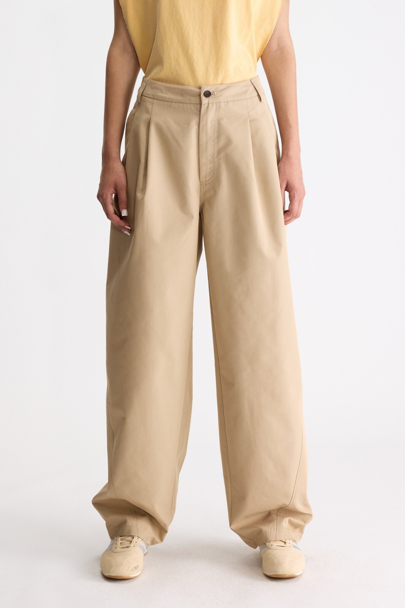 The Jimi pants are elegant wide-leg trousers with a high waist, front pleats, and a fluid fit. Timeless in a soft tone, featuring side pockets and belt loops, perfect for both casual chic and dressed-up looks.