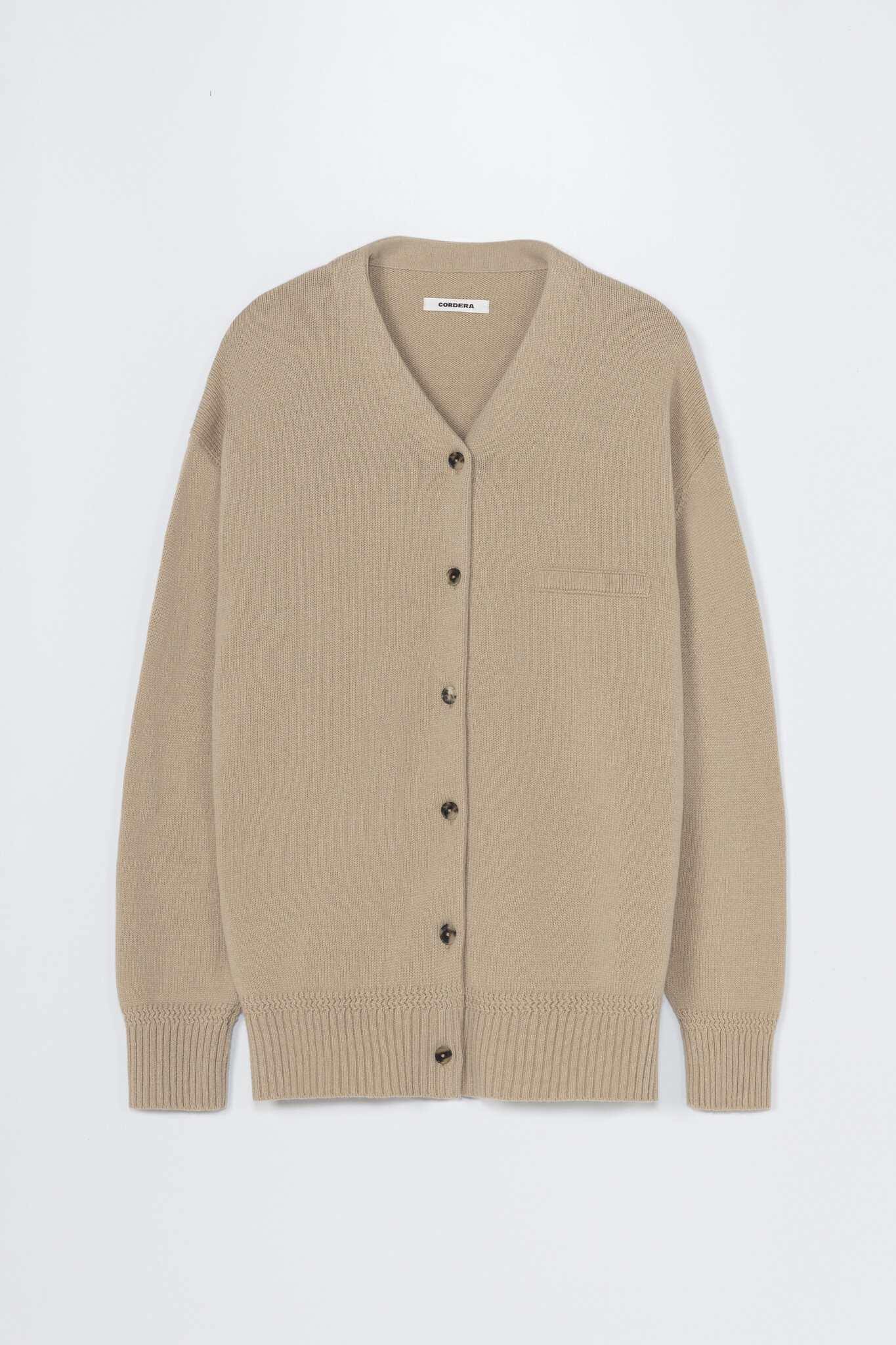 A mid-length cardigan in ultrafine merino wool with a V-neck and buttons up to the collar. It has side openings, long sleeves and a slightly oversized fit. Finished with ribbed trim in a unique pattern. Easy to wear and effortlessly stylish.