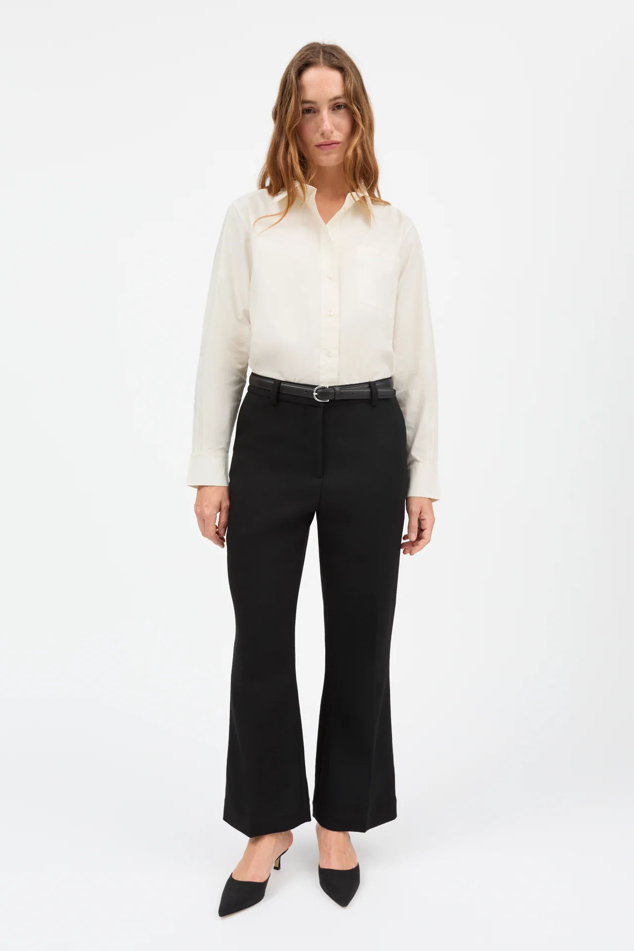The Wallace Trousers are classic low waisted pants, fitted at the hips and gently flared to ankle length. With a zip and double hook closure, side and back pockets, and front creases, they offer timeless elegance with a modern fit.
