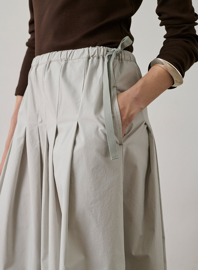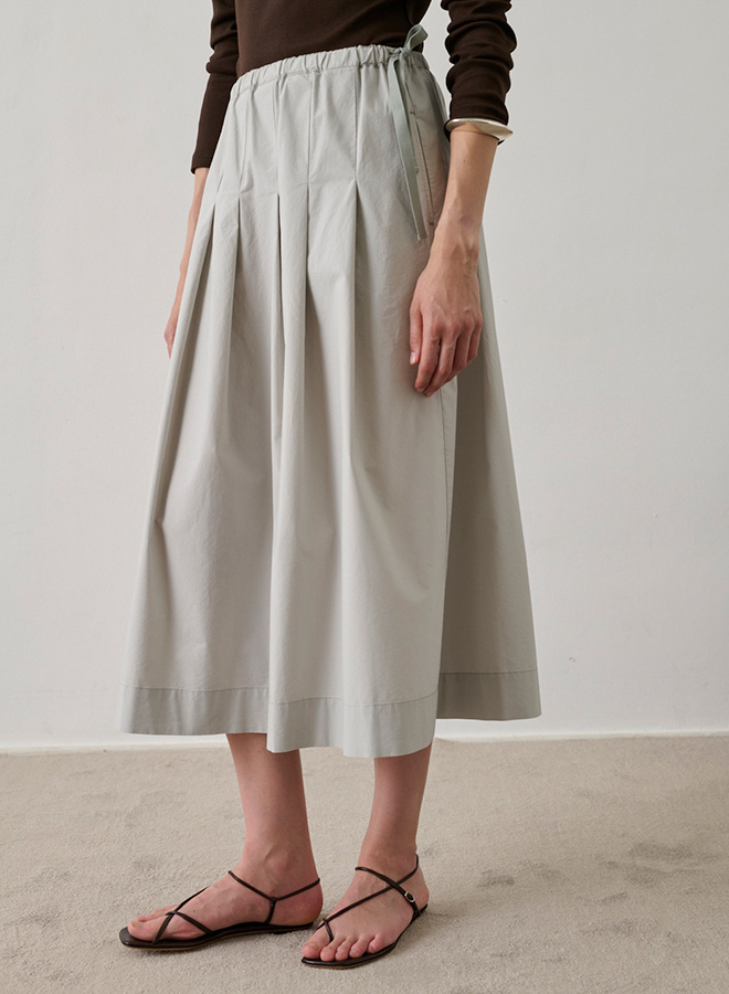 De Amalia skirt is een midi-rok met elastische taille en een verfijnd strikdetail aan de zijkant. De lichte stof valt soepel en is afgewerkt met subtiele plooien en steekzakken, wat zorgt voor een elegante maar ontspannen uitstraling.
