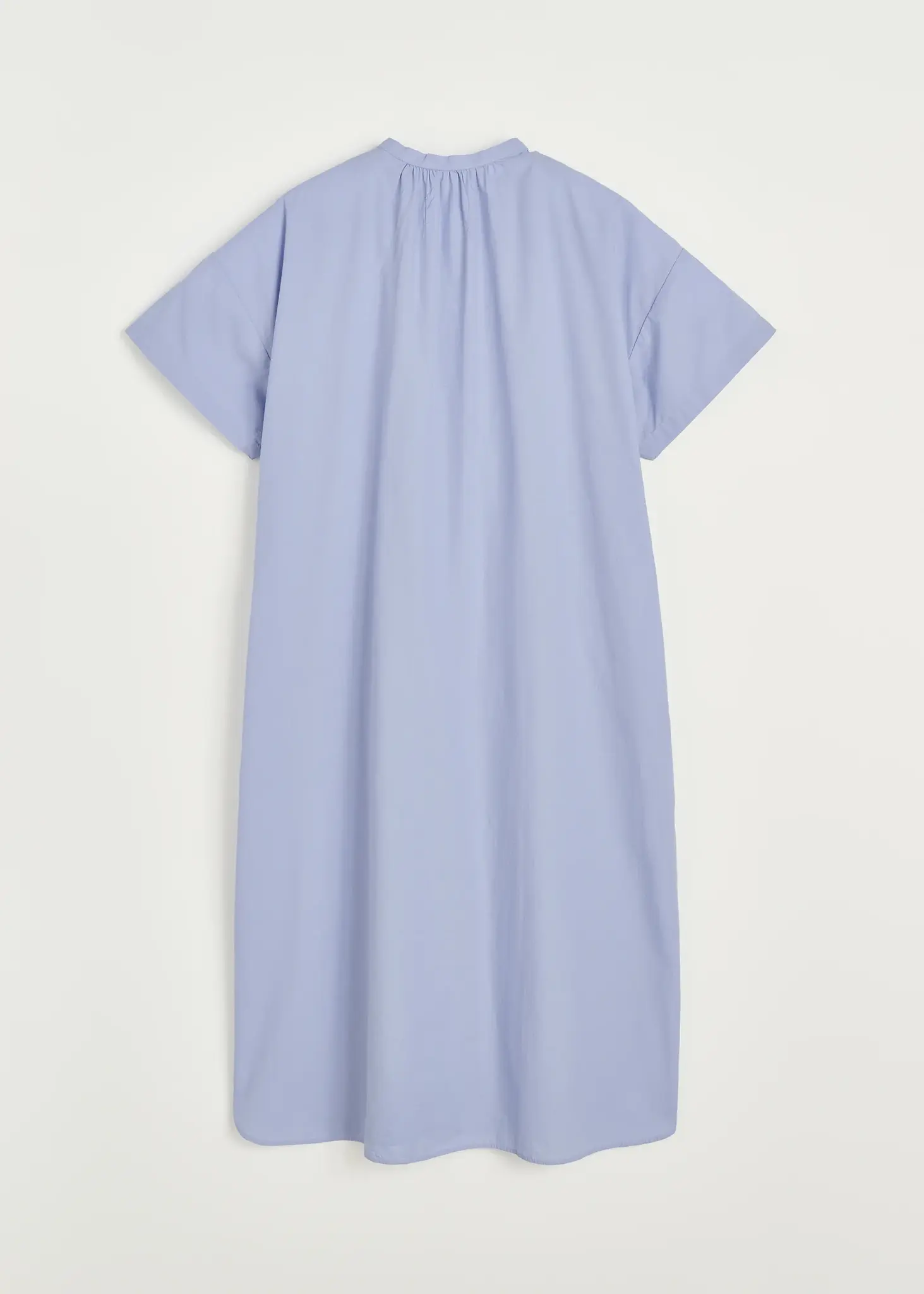 De Cille Dress is een lange jurk van zacht biologisch katoen met een rechte pasvorm, verlaagde schouders, zijsplitten en zakken. De gerimpelde hals geeft extra volume.