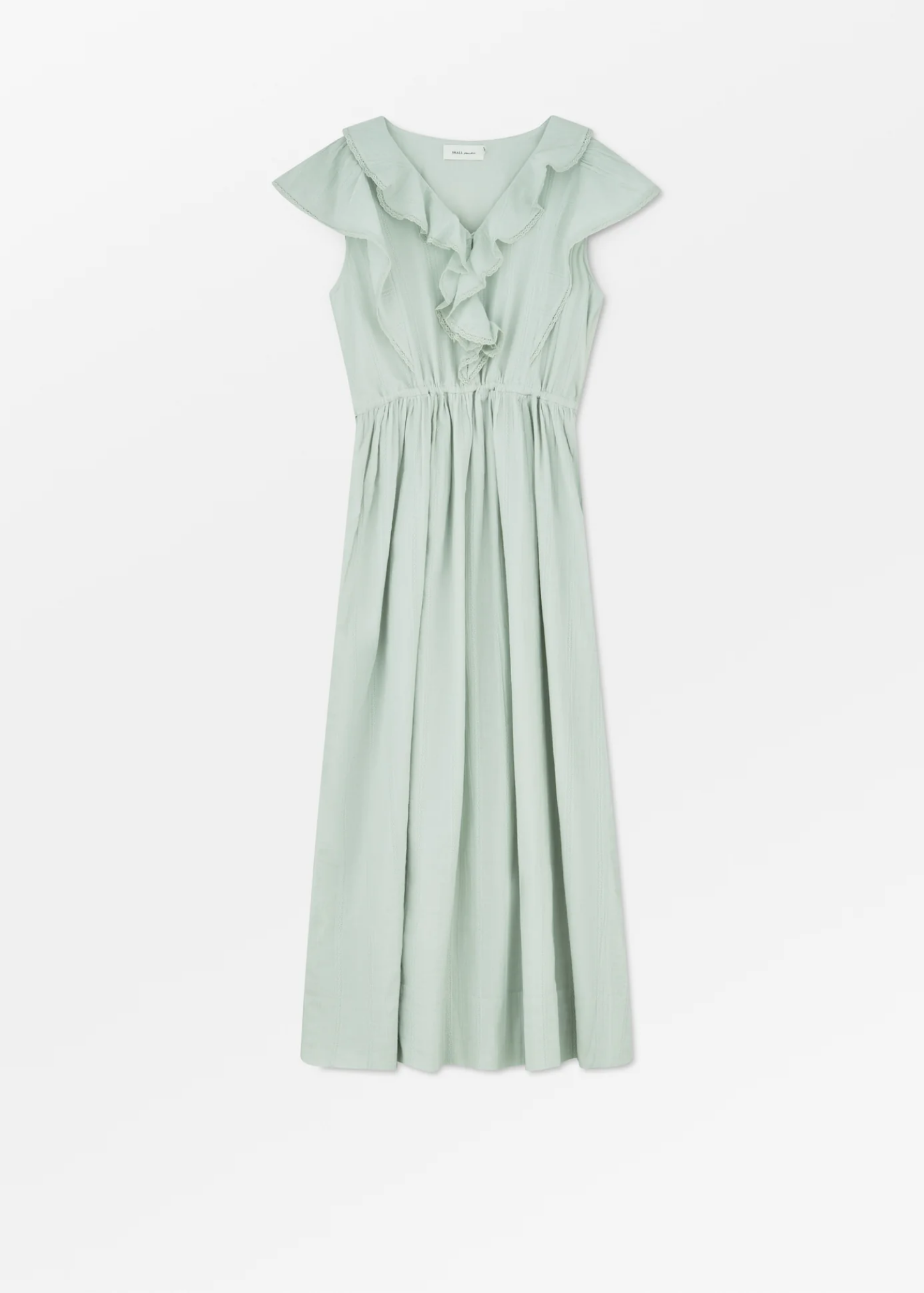 De Clea is een elegante maxi jurk met ruches en een V-hals. De subtiele ruche langs de halslijn en de kleine mouwtjes geven de jurk een romantische uitstraling. Dankzij het tunnelkoord in de taille creëer je eenvoudig een flatterend silhouet.