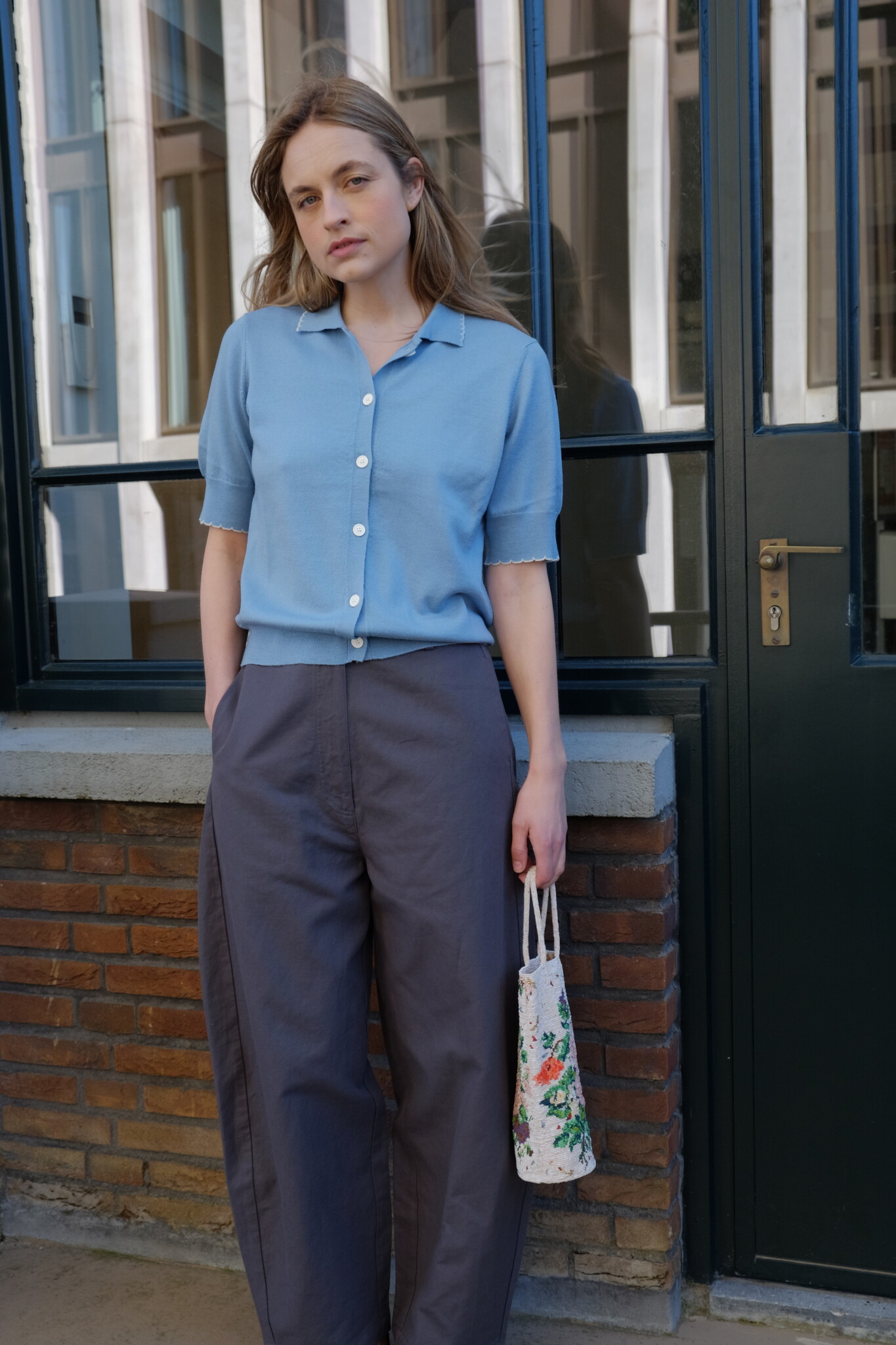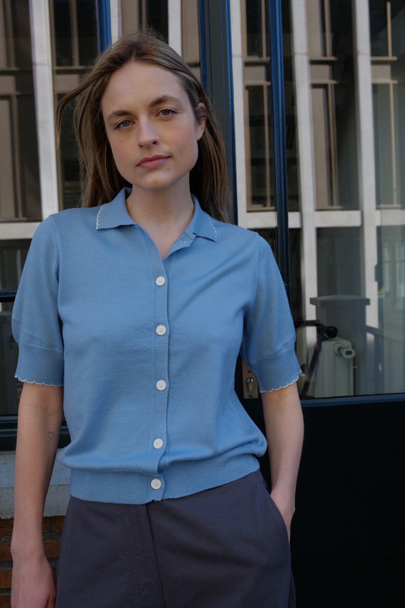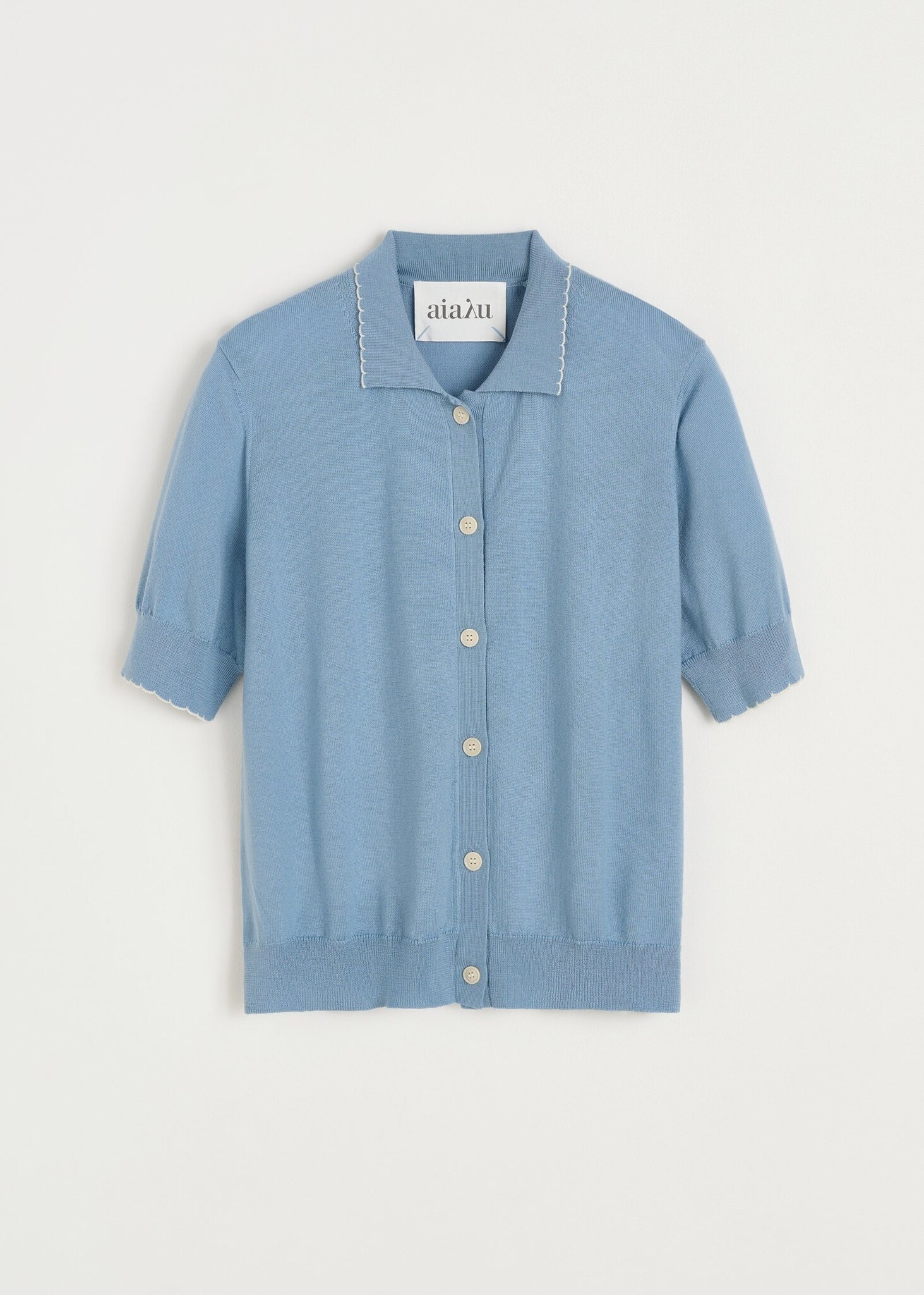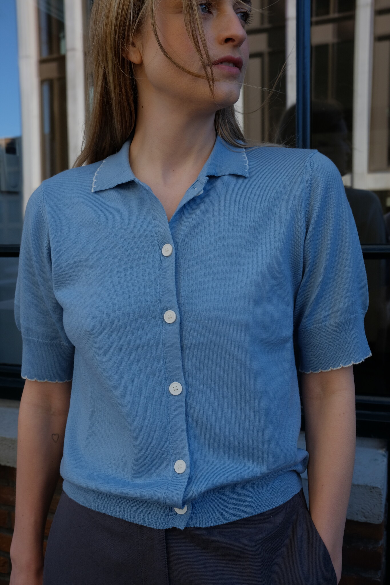 De Dish Top is een elegante, fijngebreide cardigan met korte mouwen van zachte merinowol. Het ontwerp heeft een aansluitende fit, een verfijnde kraag, knoopsluiting en contrasterende geschulpte randen voor een vrouwelijke uitstraling.
