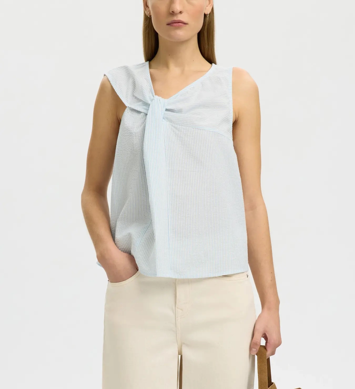 Luchtige top met subtiele streep en speelse knoopdetail bij de hals. De Hannah top heeft een mouwloos design en een losse pasvorm voor een frisse, elegante en comfortabele look.