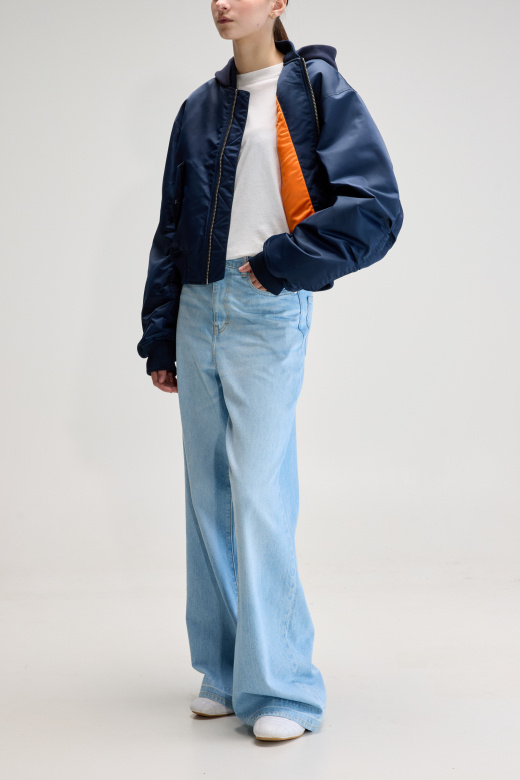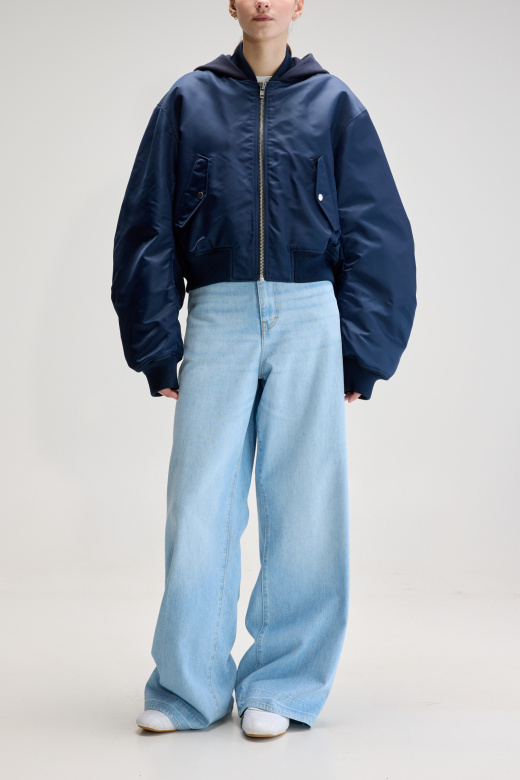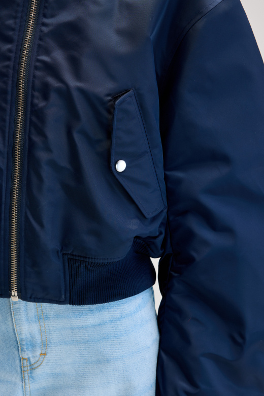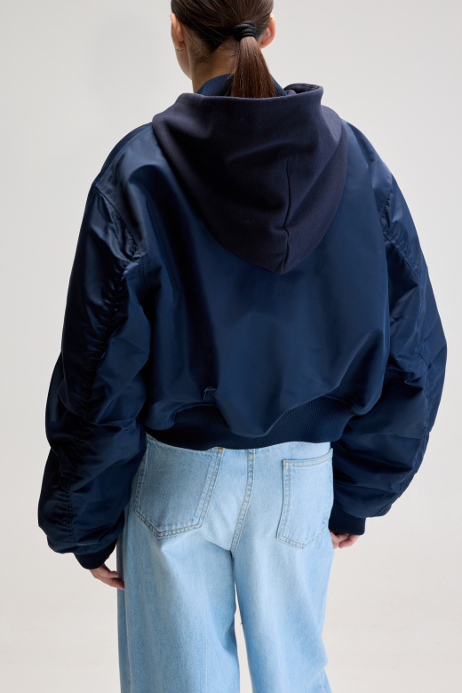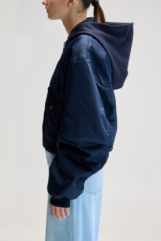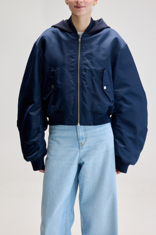 Deze klassieke bomberjas in marineblauw combineert een stoere look met vrouwelijke details. De jas heeft een korte pasvorm, capuchon, volumineuze mouwen en een satijnzachte oranje voering. Voorzien van klepzakken, rits en geribde boorden.