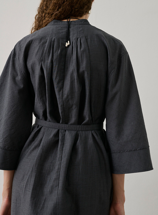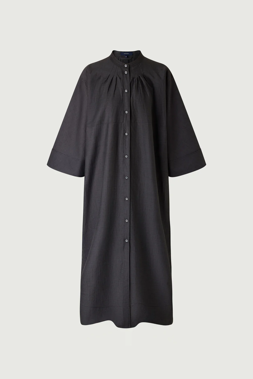De Hosta Dress heeft een uitlopende pasvorm, valt tot halverwege de kuit, heeft een ronde hals met plooien, knoopsluiting met afneembare riem, zakken en is gemaakt van katoenmix.