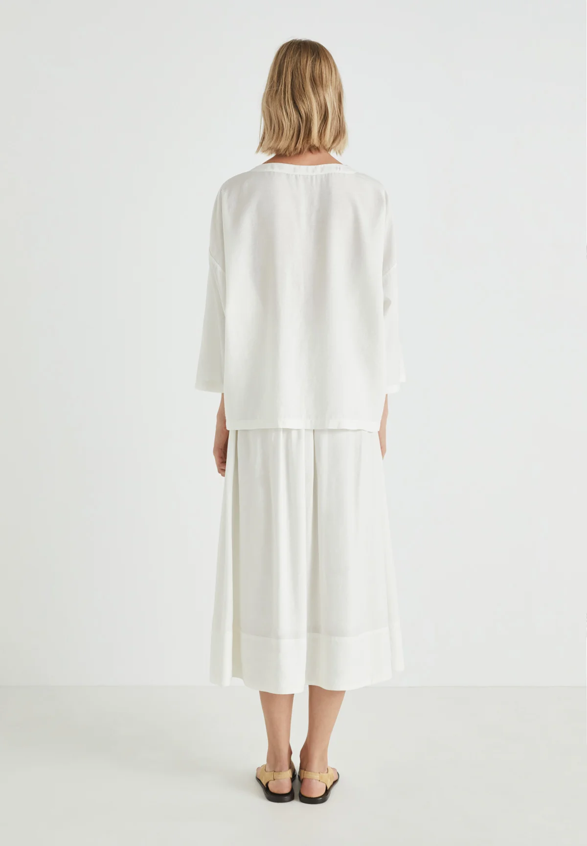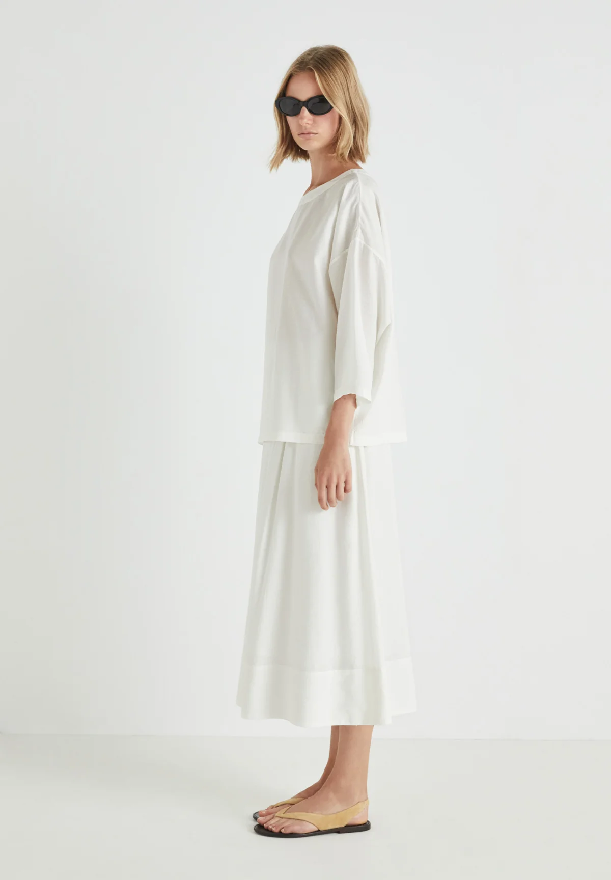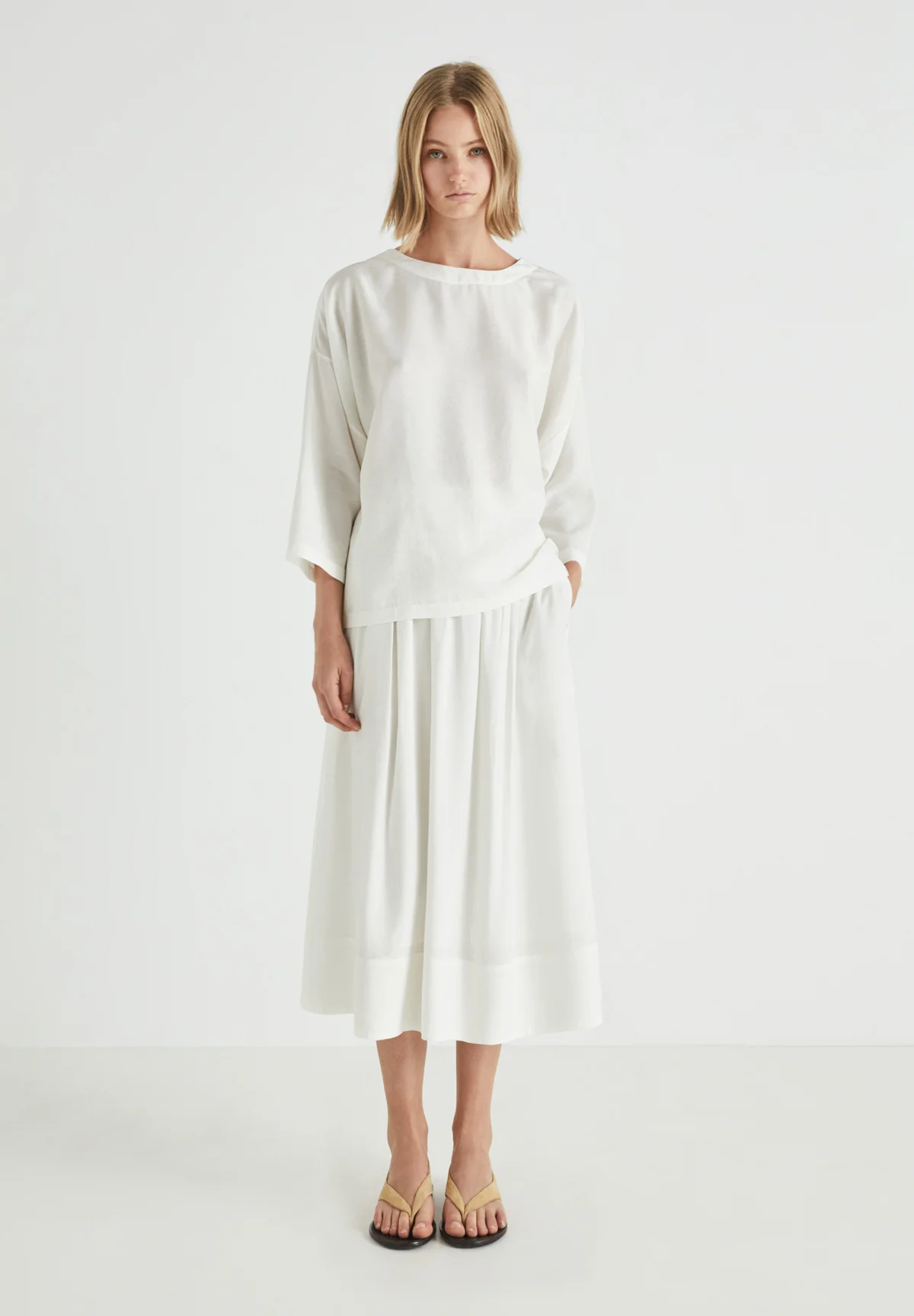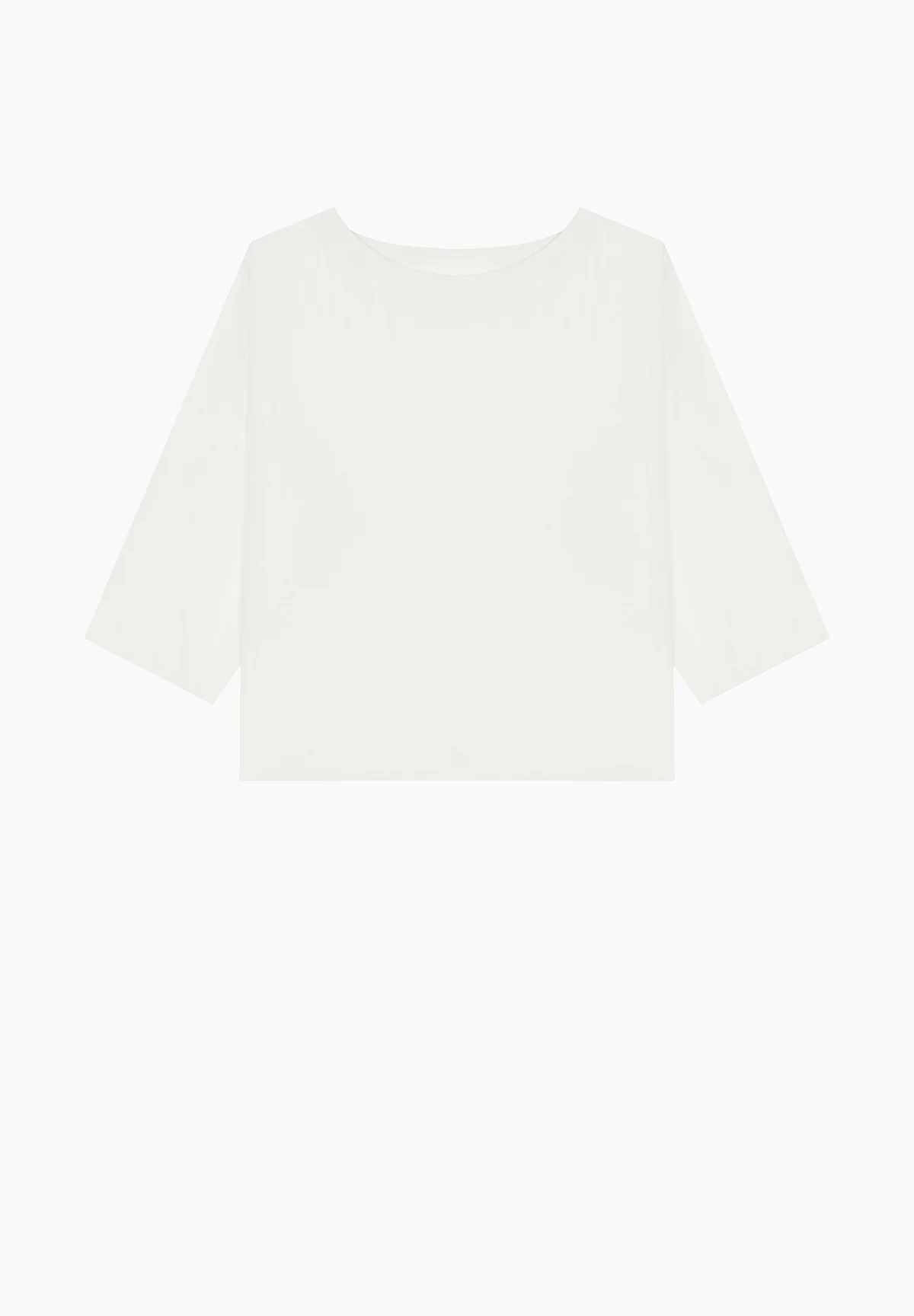 De Isla top is een minimalistische off-white top met ronde hals, wijde driekwartmouwen en losse pasvorm. Licht en soepel vallend, perfect voor een moderne look.
