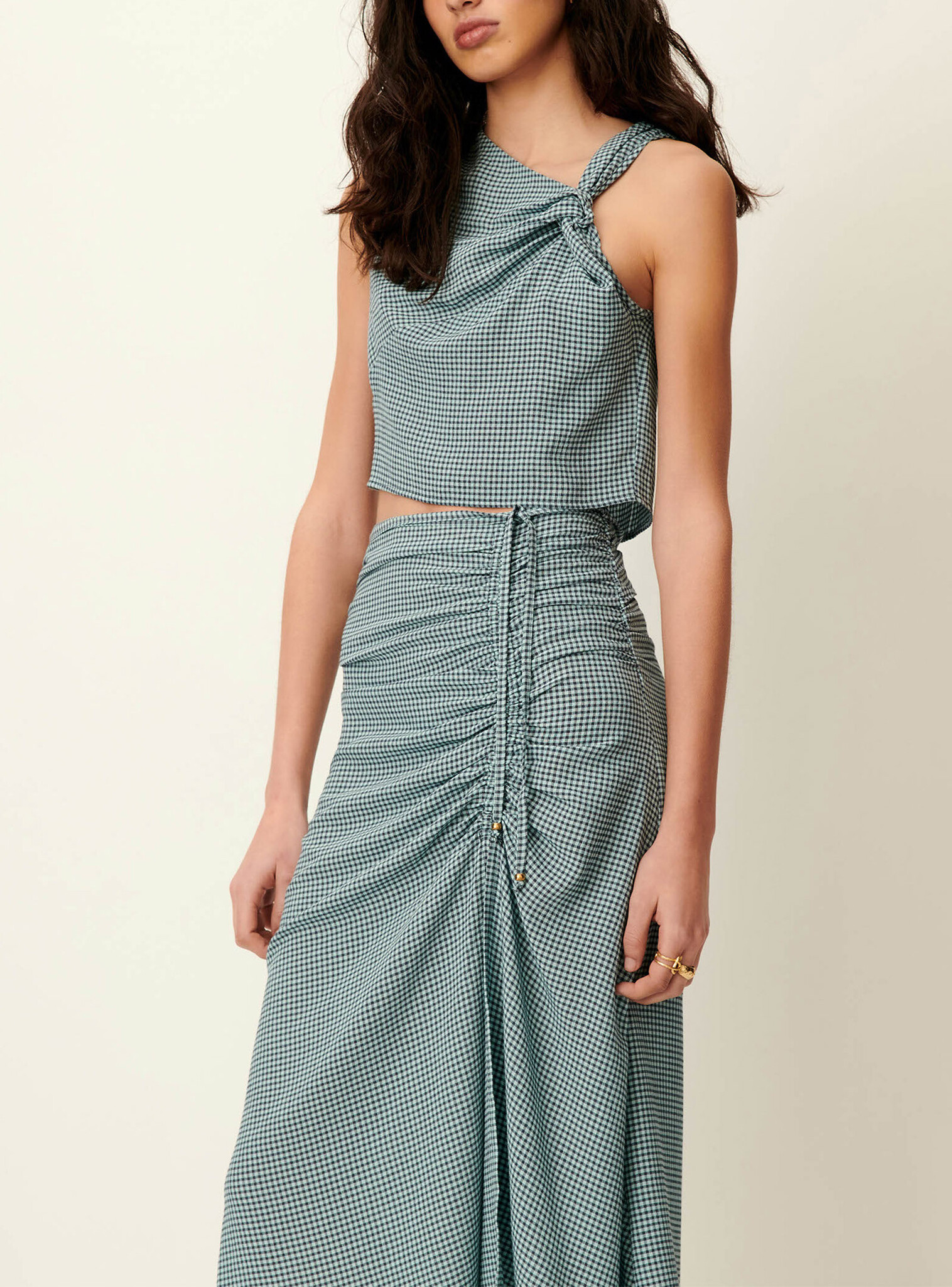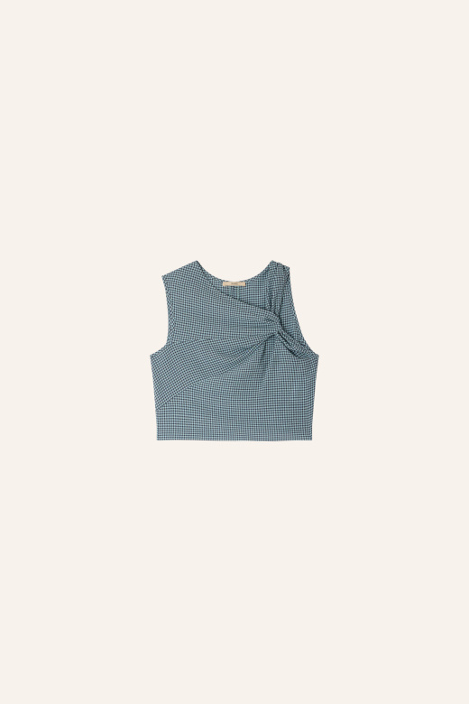 Uma top met asymmetrische hals en gedraaid detail. Mouwloos model met tweekleurig ruitmotief. Split achteraan. Licht, luchtig en vrouwelijk met een moderne uitstraling.