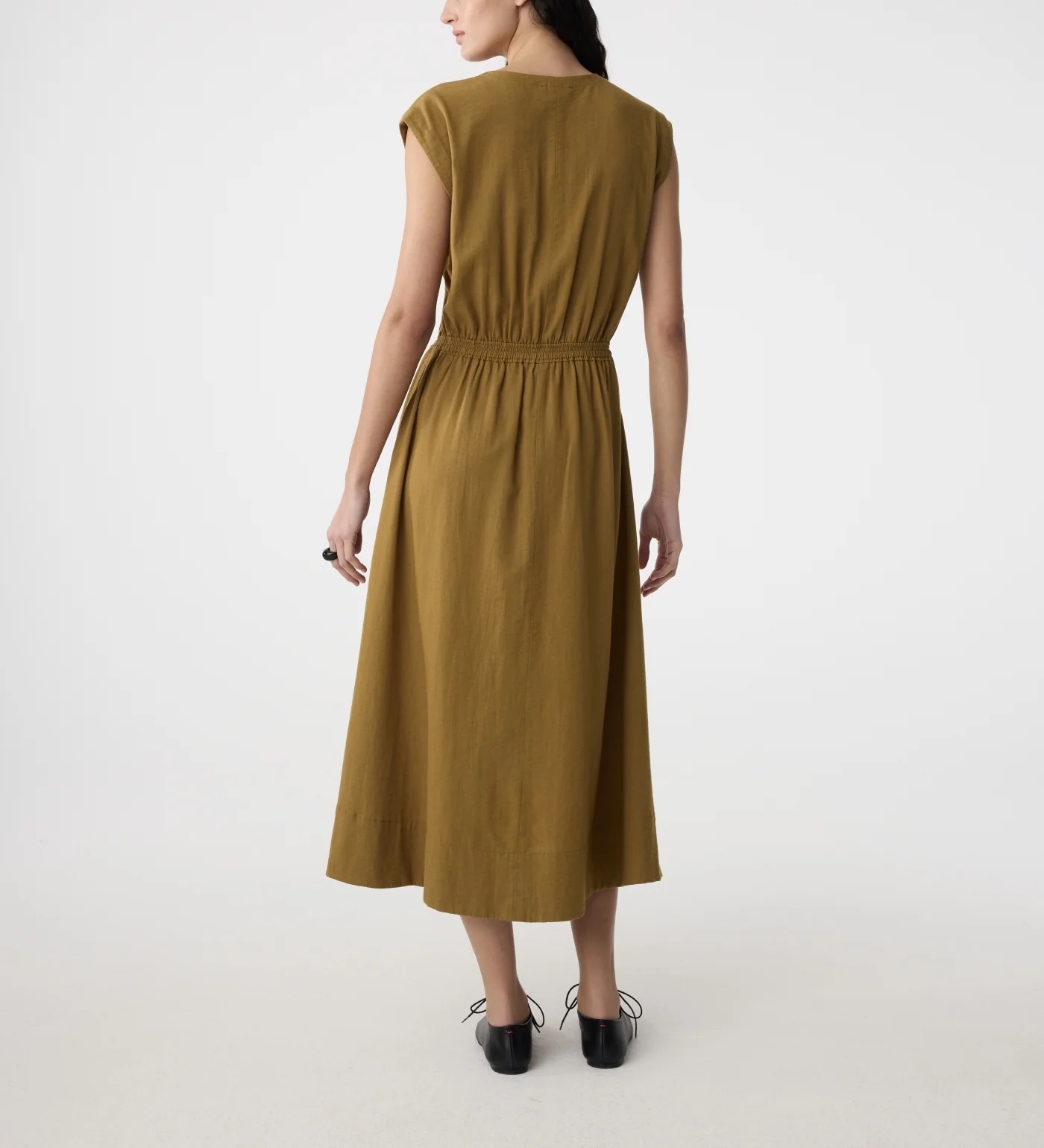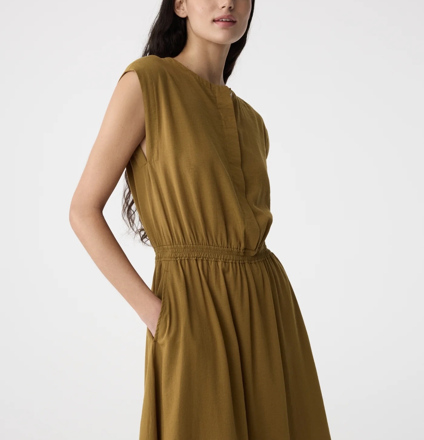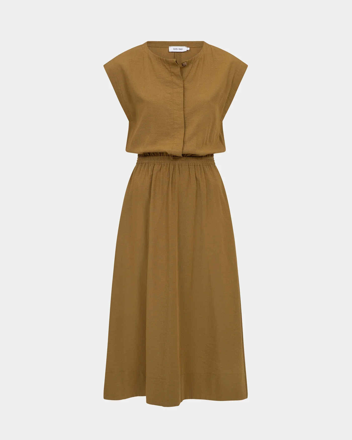 Max Dress met minimalistisch design, dropped shoulders en vloeiende midi-lengte. Elastische taille voor een mooie pasvorm en verborgen knopen voor veelzijdig dragen.
