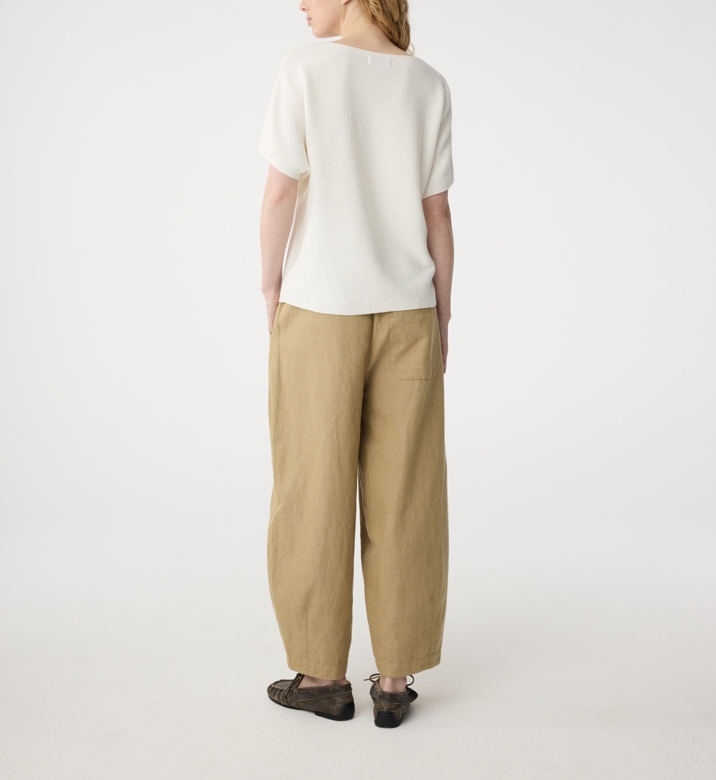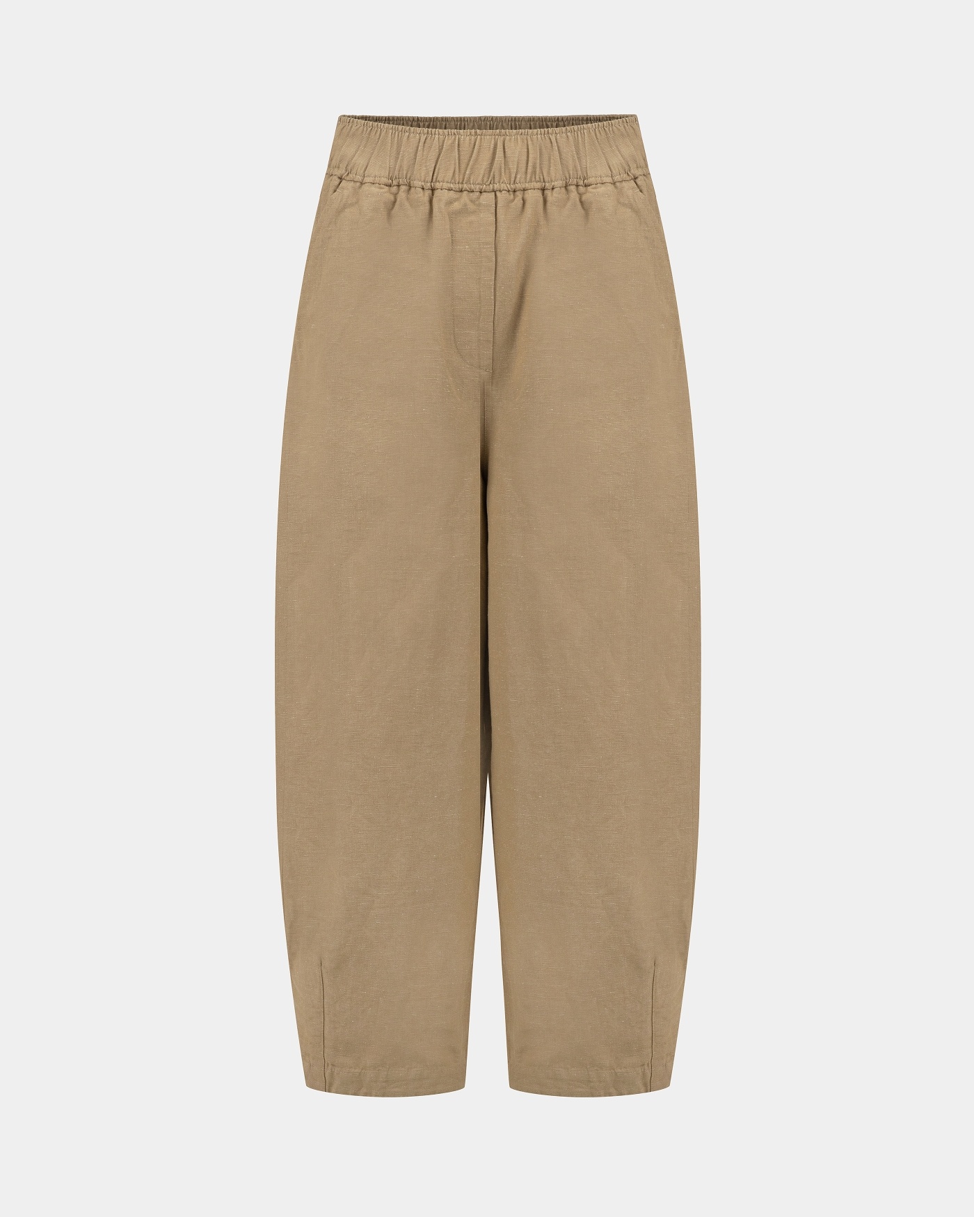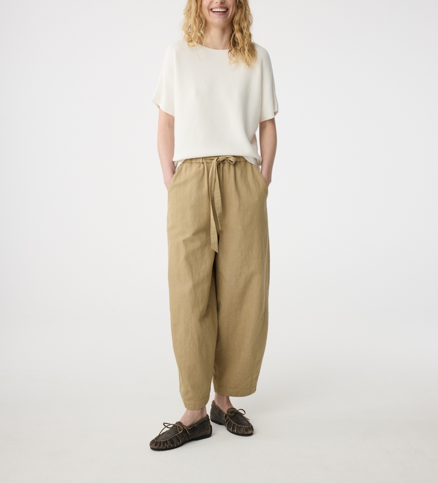 Mona heeft een ballonfit: ruim bij het been en smaller bij de enkel. De elastische tailleband zorgt voor comfort. Met schuine zijzakken en een opvallende achterzak. Gemaakt van luchtige katoen-linnenmix.