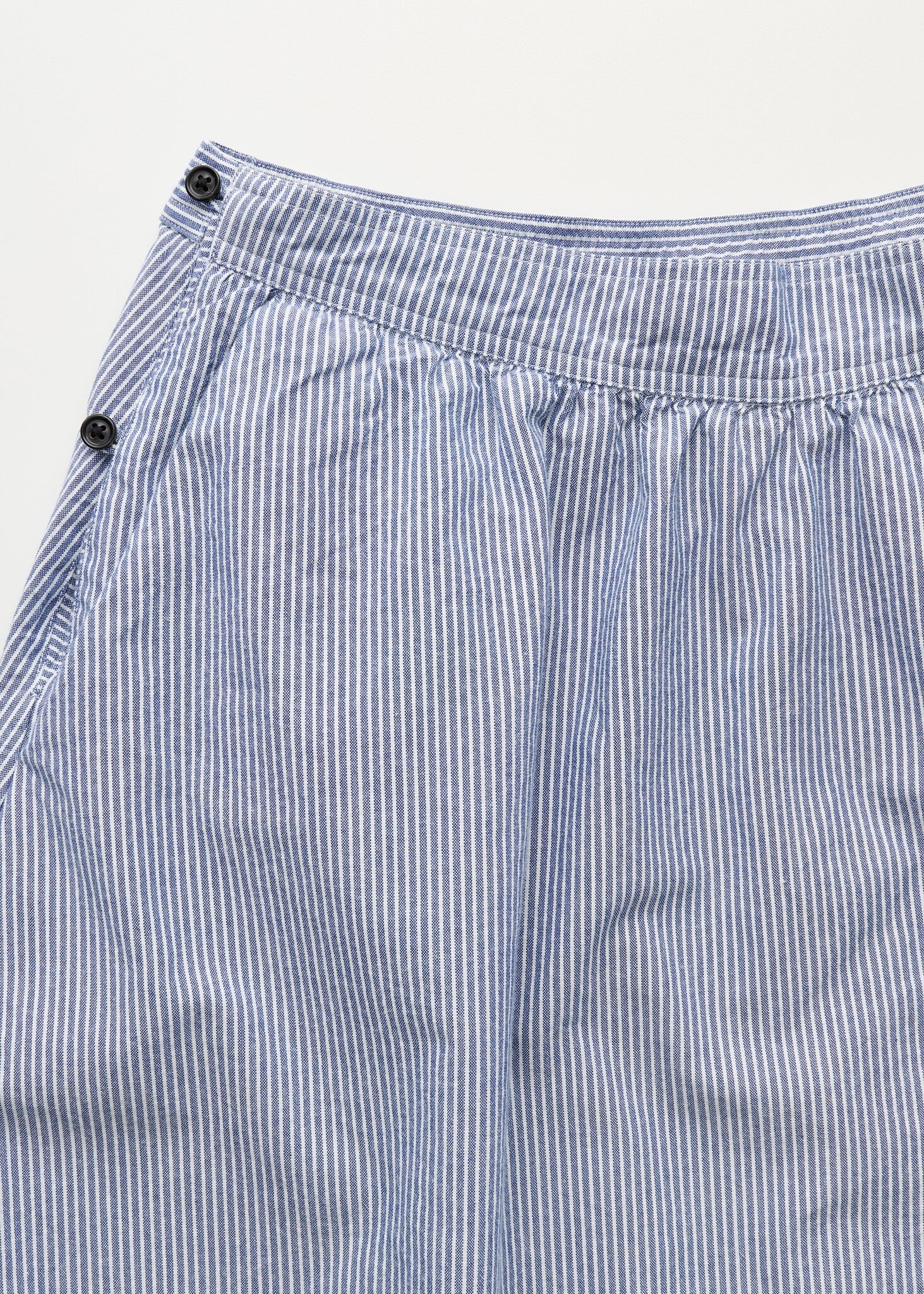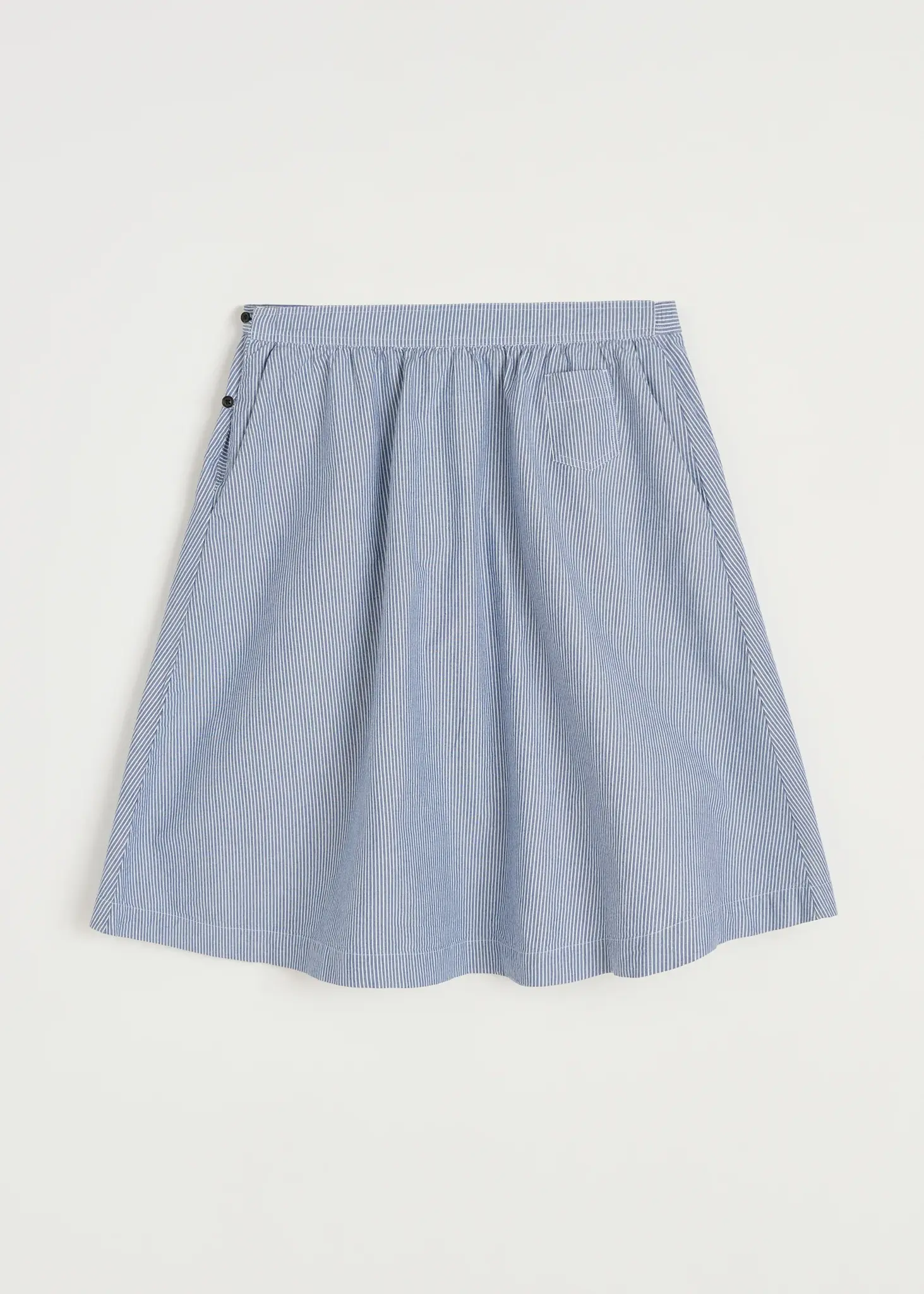 De Neela Skirt Striped is een tijdloze midi rok van biologisch katoen met een A-lijn pasvorm, elastische taille achter, knoopsluiting en ruime steekzakken met subtiele blauwe streep.