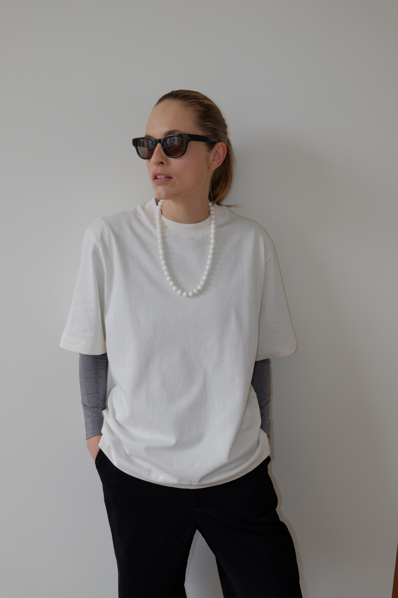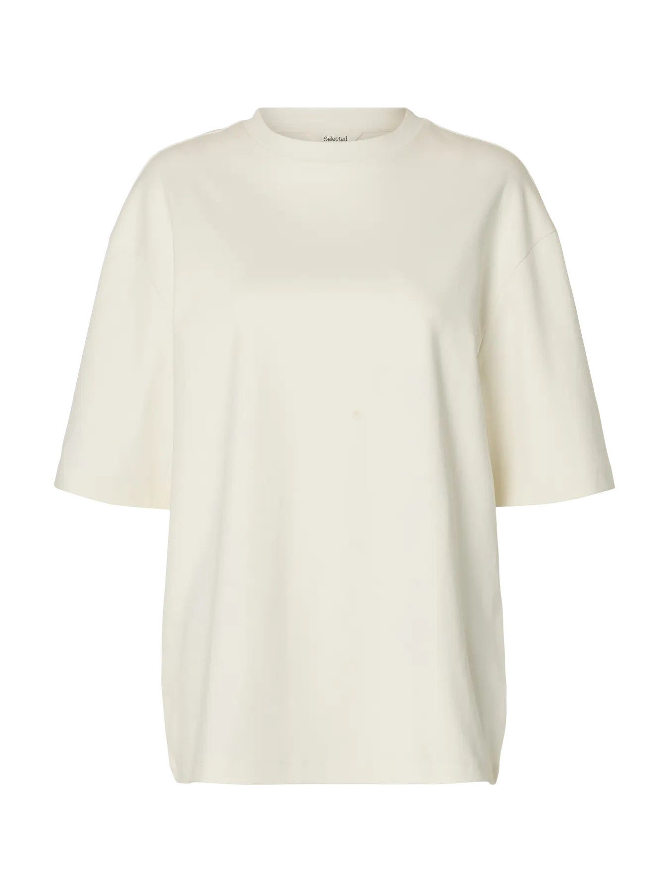 Oversized T-shirt van zacht biologisch katoen. Comfortabele, ruime fit met een minimalistische uitstraling. Ademend, duurzaam en perfect voor een relaxte, moderne look.