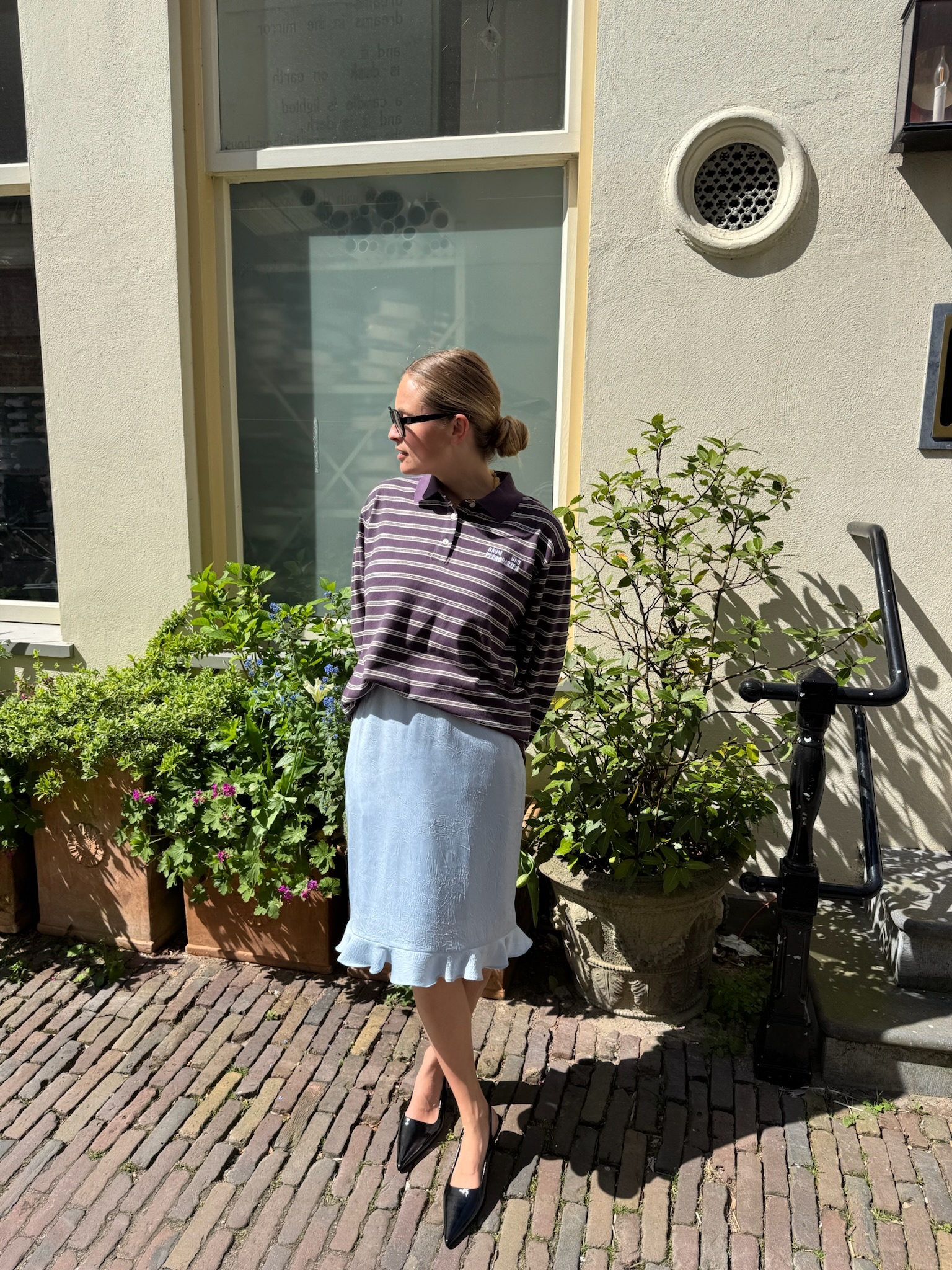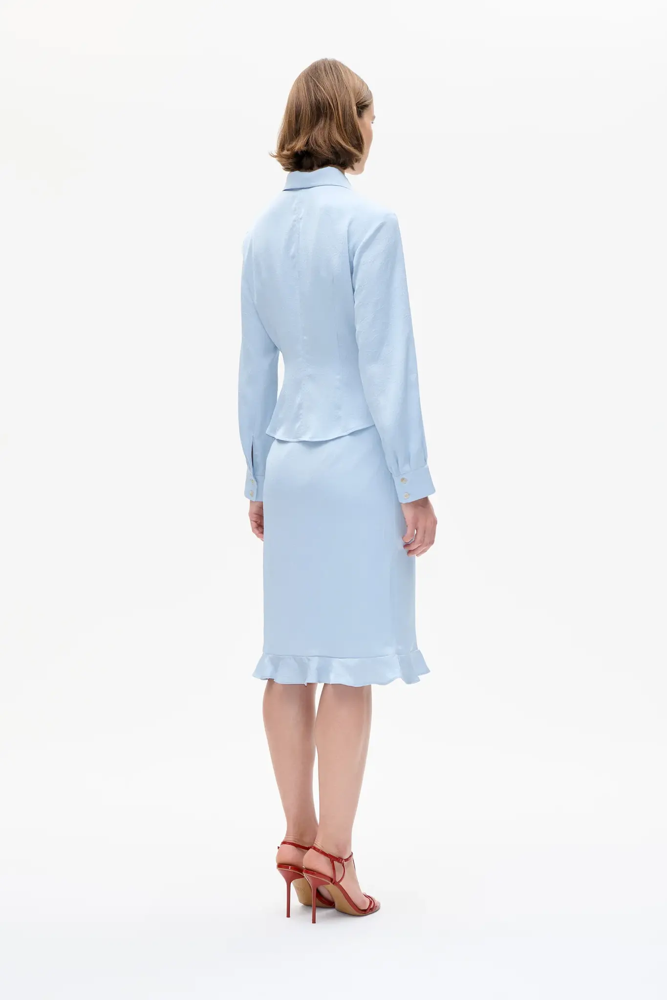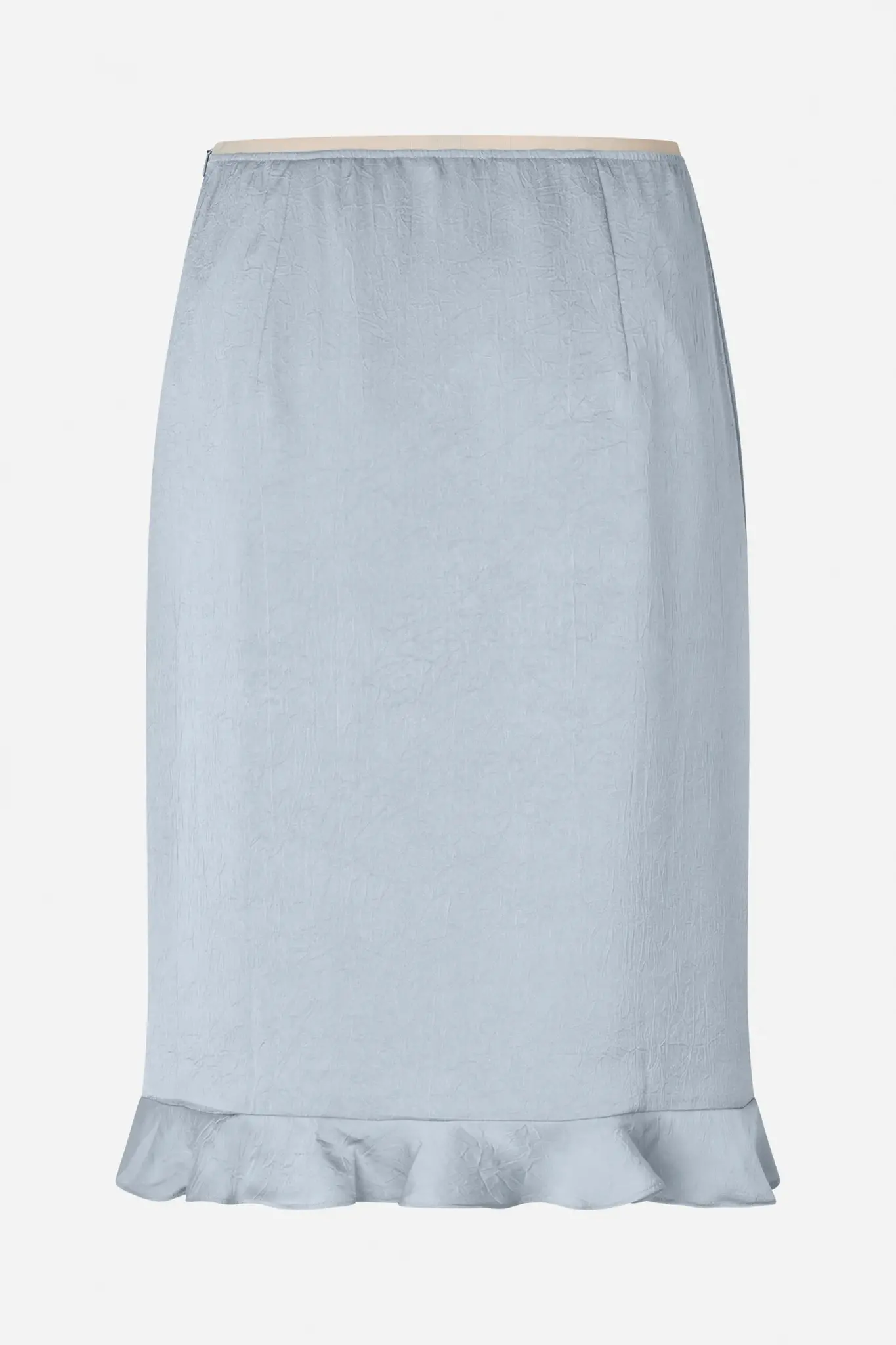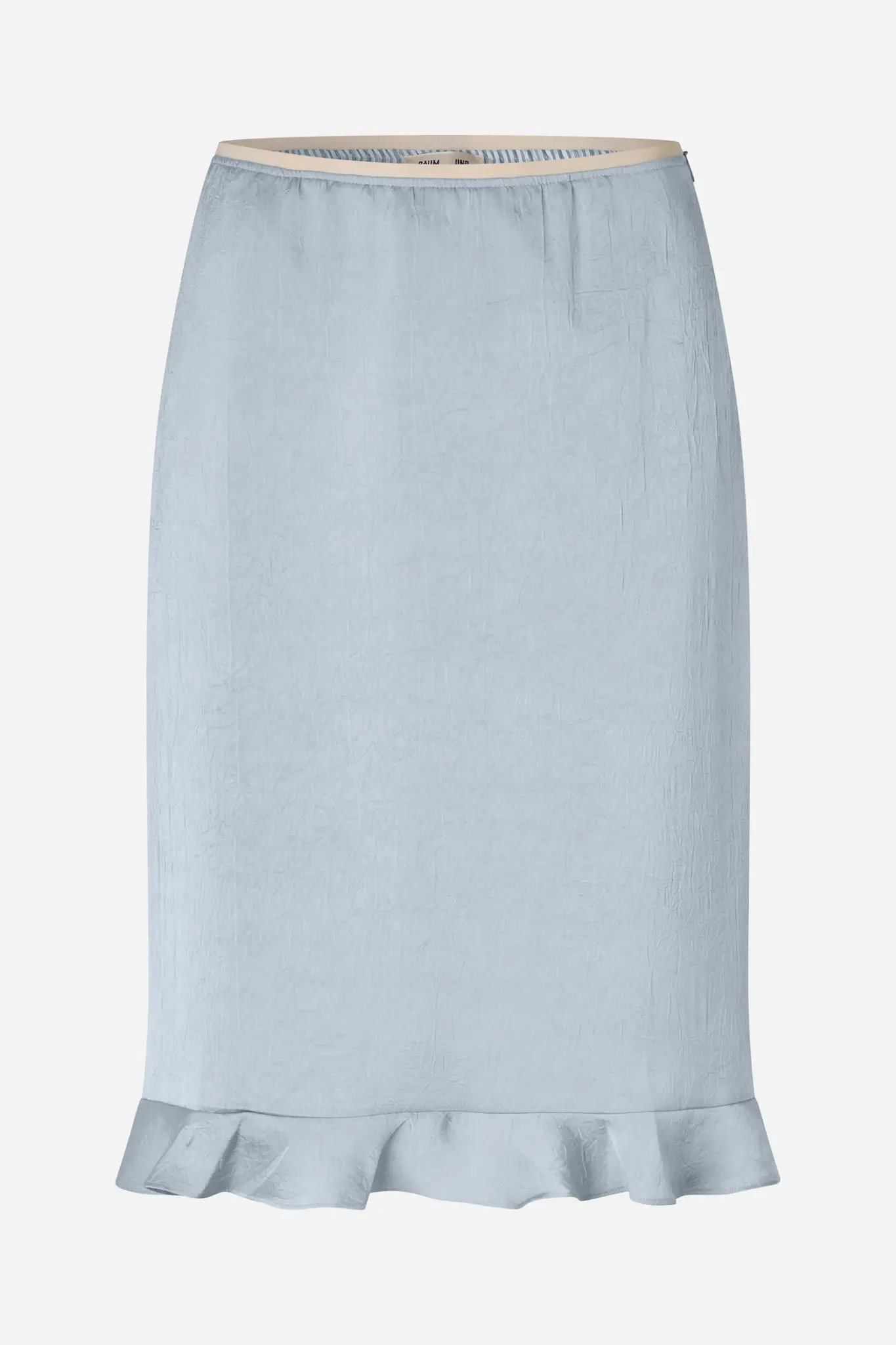 De Sesse rok is een verfijnd maar speels ontwerp van gekreukelde satijn, met een hoge taille en ruches aan de zoom voor een flatterend silhouet. De volledig gevoerde midi-rok heeft een korte tailleband en een ritssluiting aan de zijkant.