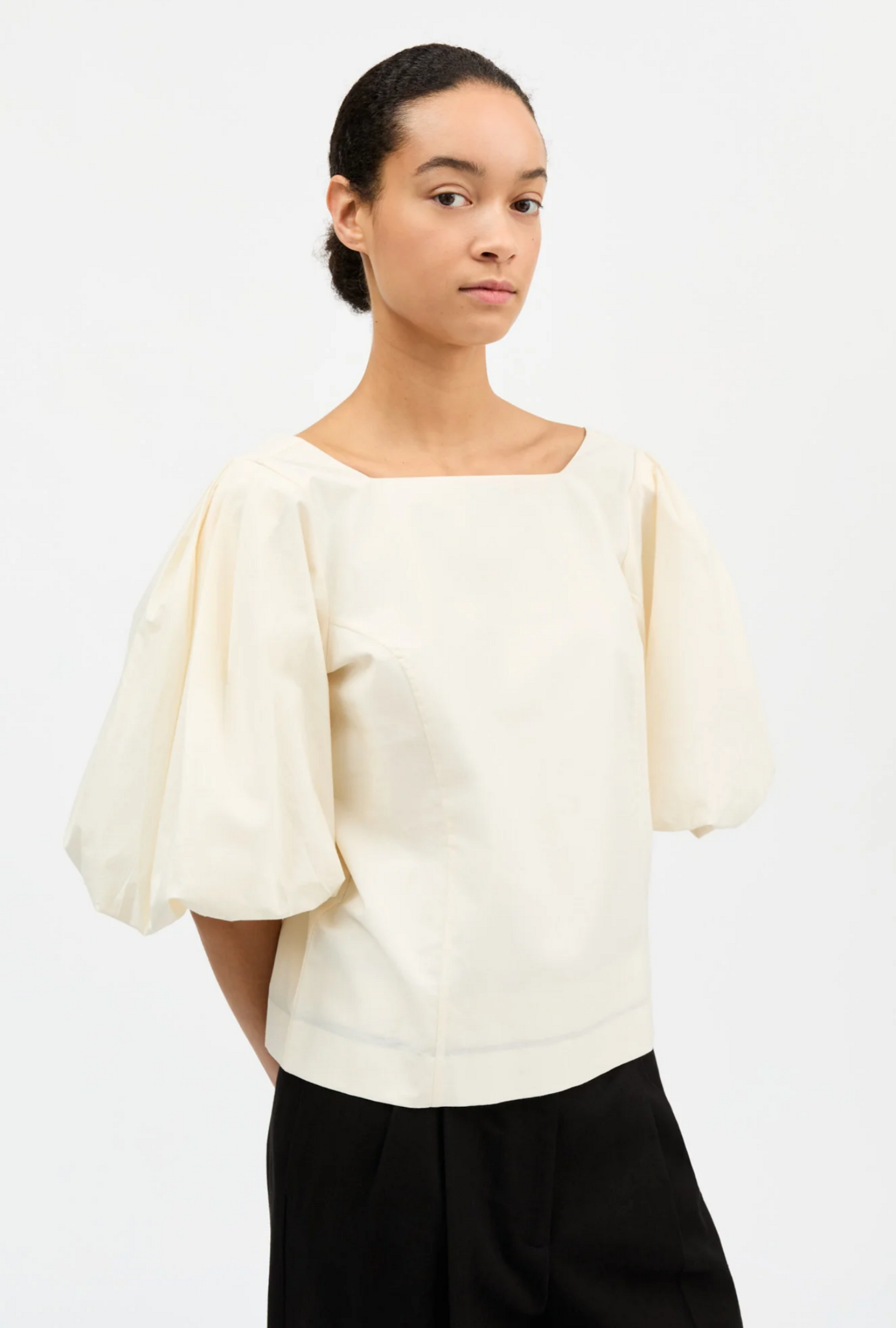 De Sevilla is een statement blouse met volumineuze mouwen en een elegante vierkante halslijn. De open, lage rug geeft het model een vrouwelijke uitstraling. Een perfecte balans tussen romantisch en eigentijds design.