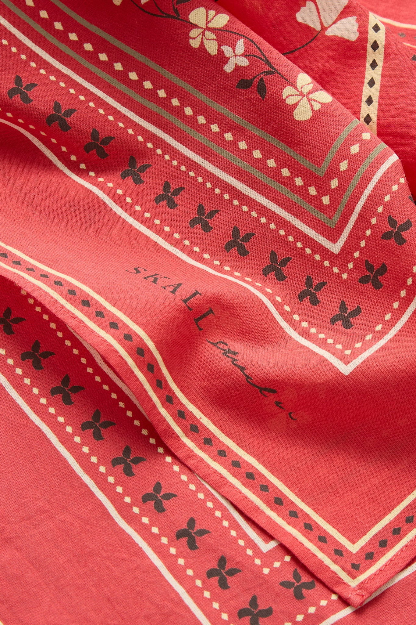 De Skall Floral Scarf is een kleine sjaal van 100% katoen met een delicaat bloemenmotief binnen een sierlijke rand. Draag hem om je hals voor een elegante finishing touch aan elke outfit.