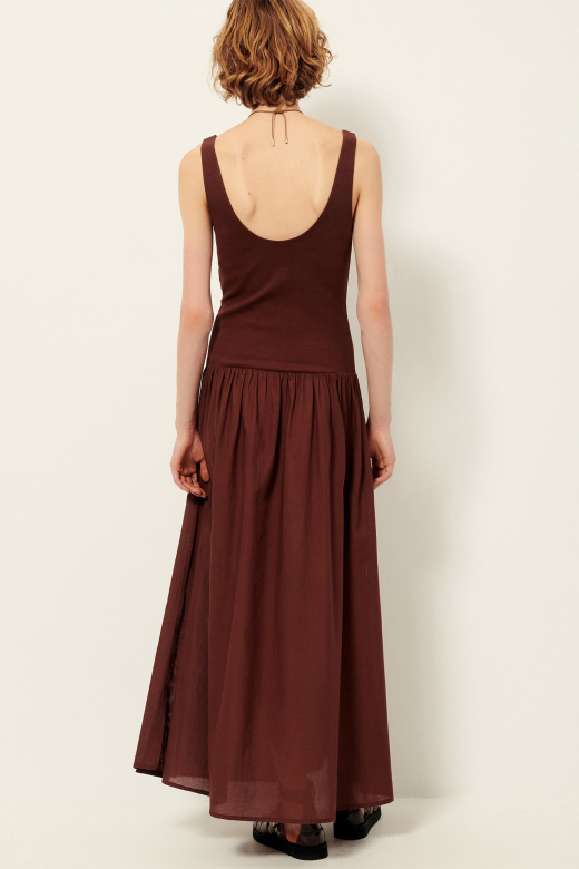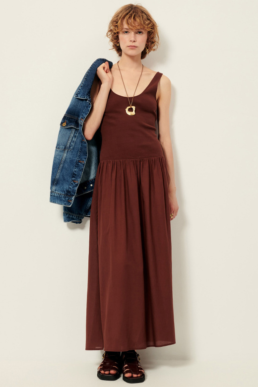 Lange mouwloze jurk geïnspireerd op de wereld van dans. Het bovenstuk is uitgevoerd in fijne geribde jersey die mooi aansluit op het lichaam, terwijl de rok van katoen en viscose voile zorgt voor een luchtige, vloeiende beweging.