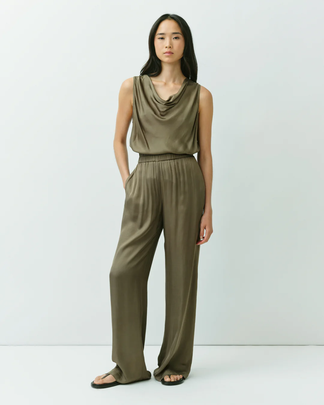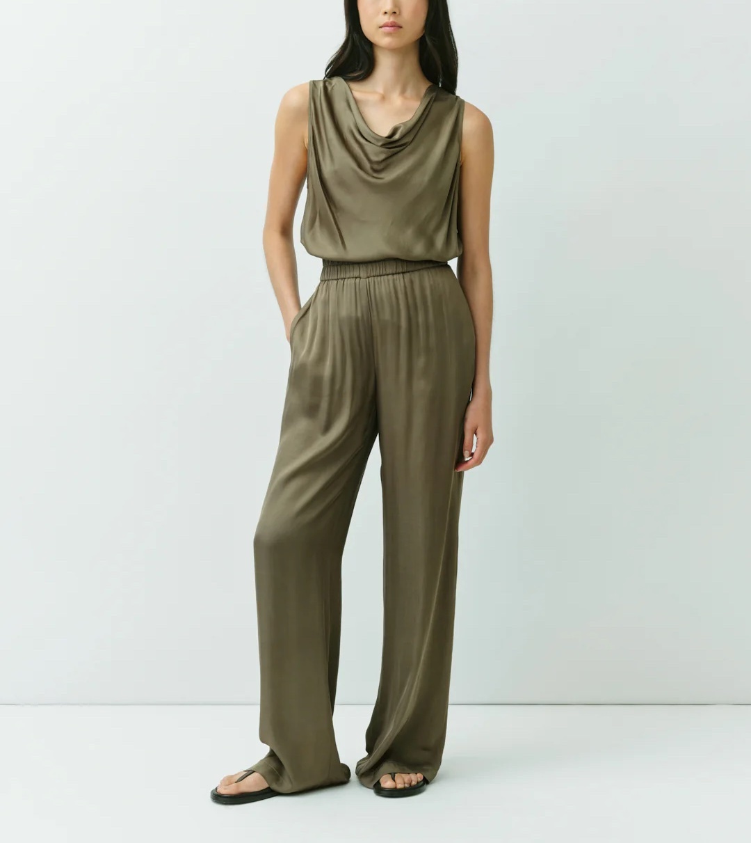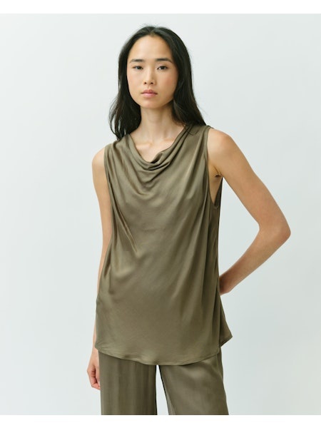 Mouwloze top in glanzend groen met een mooi vallende halslijn. De soepele stof en elegante snit zorgen voor een vrouwelijke en verfijnde uitstraling.
