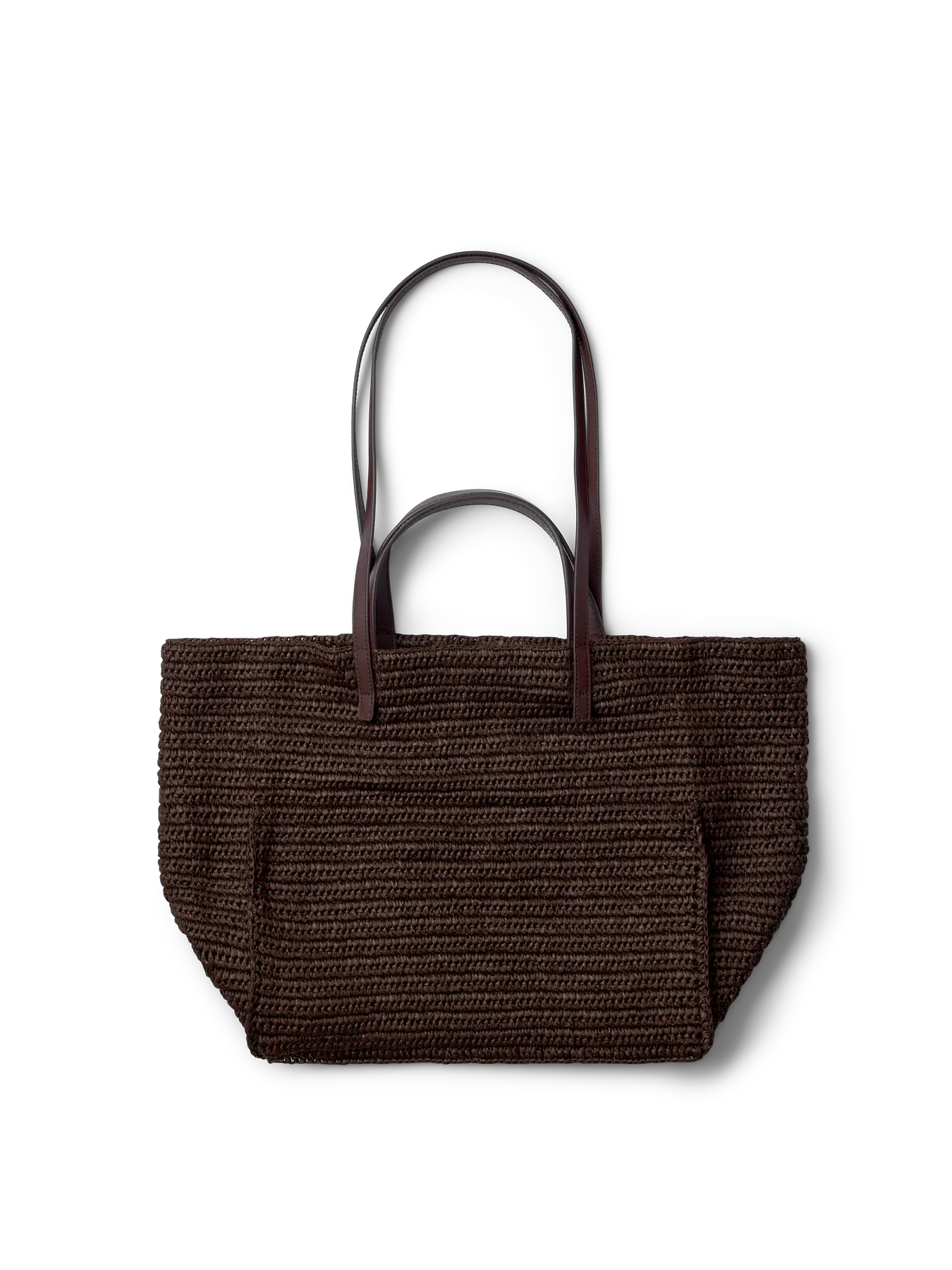 Stijlvolle Tori tote bag van handgeweven materiaal in diepbruin, met stevige leren handvatten. Ruim en tijdloos ontwerp, perfect voor dagelijks gebruik met een elegante uitstraling.