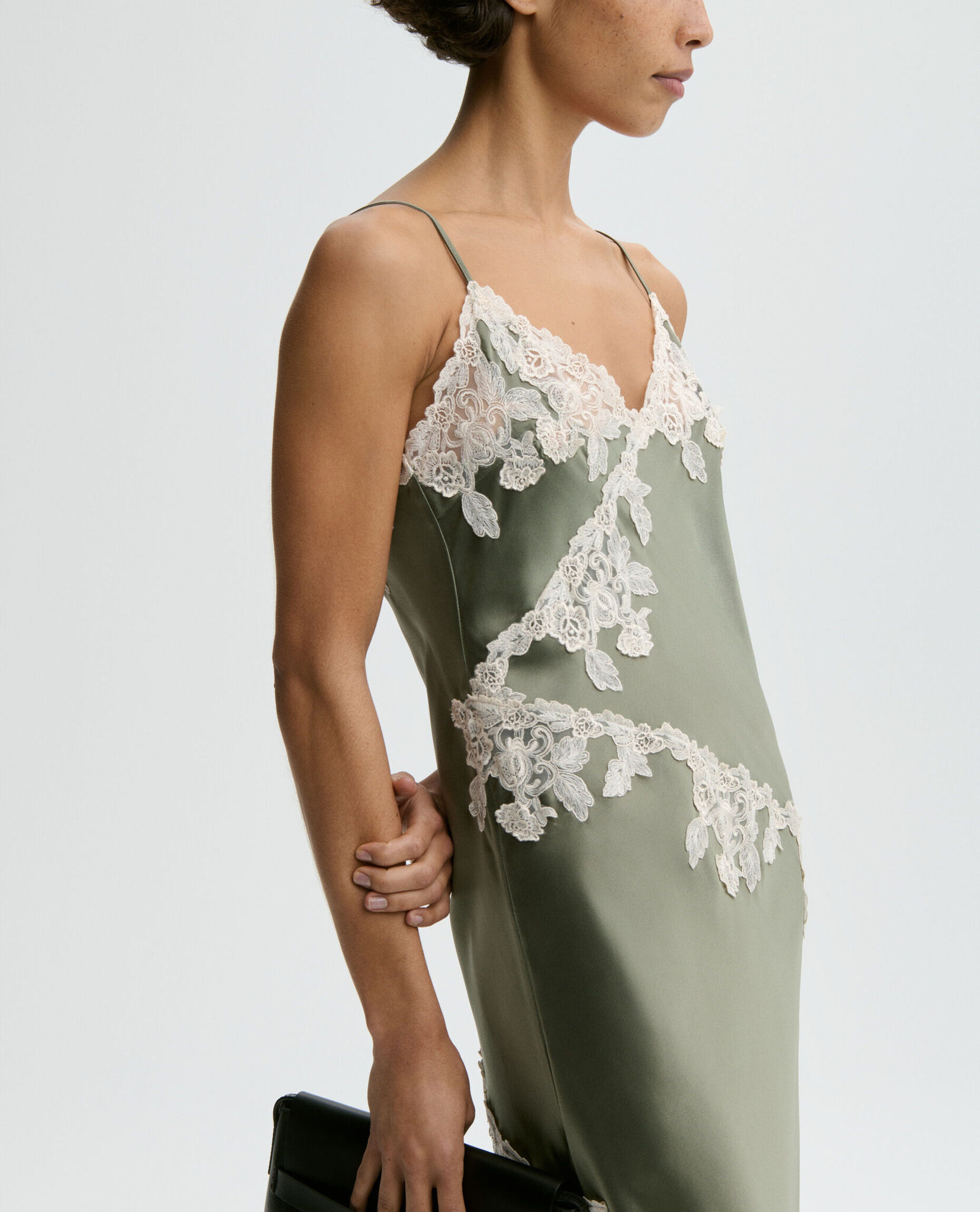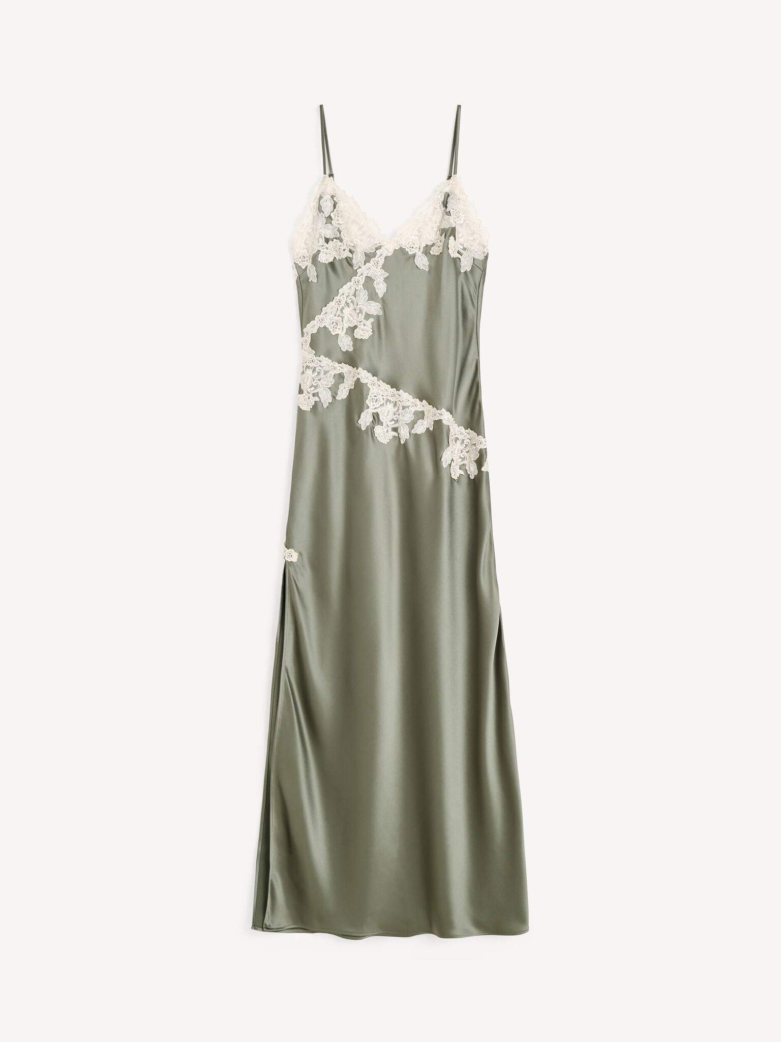 De Vera maxi jurk straalt romantiek uit met luxe satijn en vintage kanten details. Met V-hals, verstelbare bandjes en hoge zijsplit. Regular fit en maxi lengte voor een elegante, sensuele look.